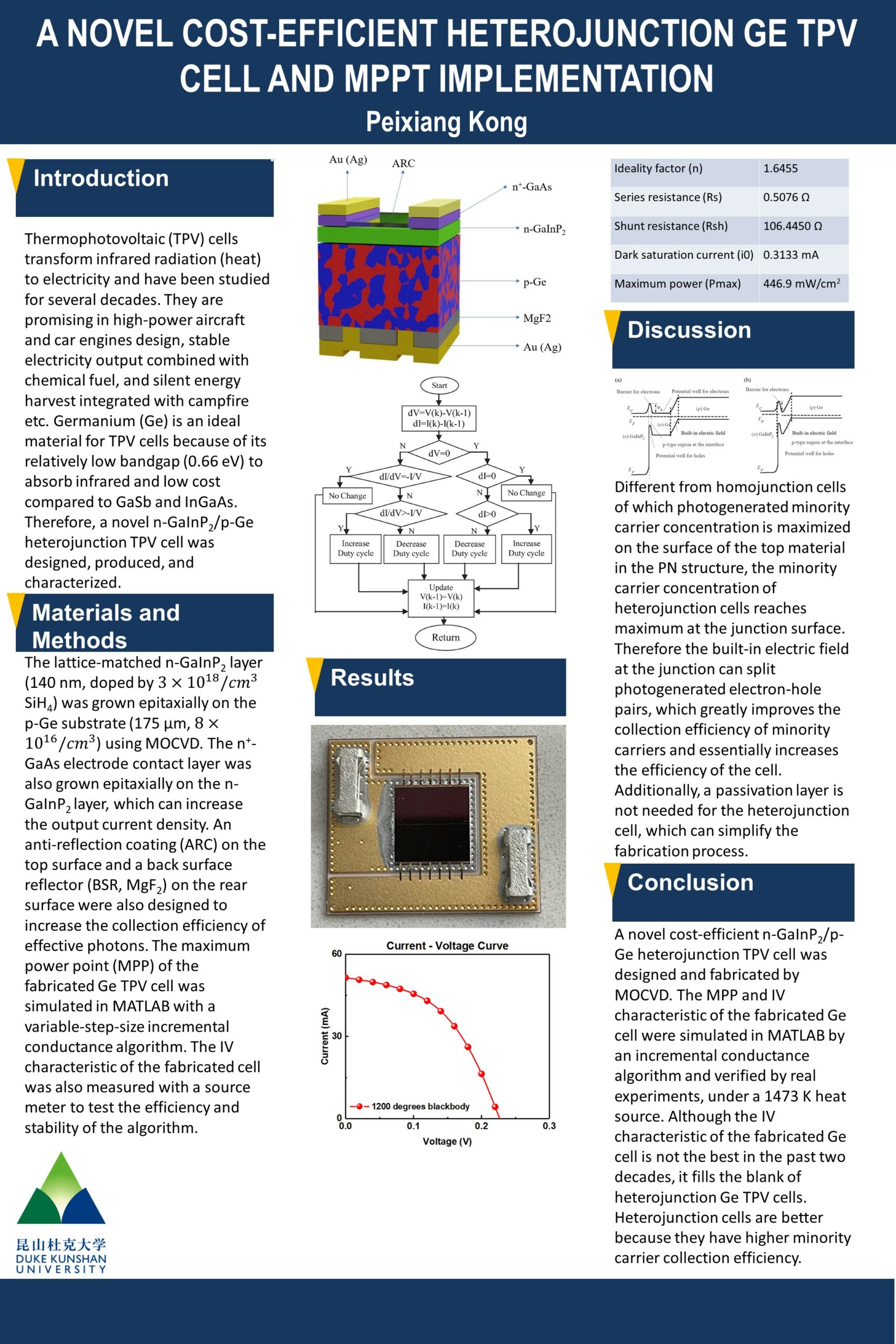 Thermophotovoltaic (TPV) cells transform infrared radiation to electricity by photoelectric effect and are promising in industries like high-power engines design. Germanium (Ge) is an ideal material for the TPV application because its low bandgap matches the infrared spectrum and the fabrication cost of Ge cells is relatively inexpensive. The purpose of this thesis is to 1) summarize the development of Ge cells for the past two decades, 2) propose and characterize a novel n‐GaInP2/p‐Ge heterojunction TPV cell, 3) implement an incremental conductance algorithm for maximum power point tracking (MPPT) of the fabricated TPV cell. The IV characteristic of the fabricated cell was measured by a source meter under different illuminations and fitted by a program, whose maximum power was also tracked by the incremental conductance algorithm in simulation. The maximum power generated and several fitted parameters of the fabricated TPV cell under the 1500 K illumination are at the medium level compared to previously reported Ge cells. The fabricated TPV cell has excellent VOC and JSC. To further improve the cell, thickness of the Ge substrate and design of the cell structure can be optimized. The implemented incremental conductance algorithm showed excellent tracking accuracy and stability with minor oscillation at maximum power point under normal operation condition. Heterojunction cells are intrinsically better than homojunction cells because heterojunction cells have improved collection efficiency of minority carriers and can reduce the production cost by allowing lower-quality film at the PN junction.