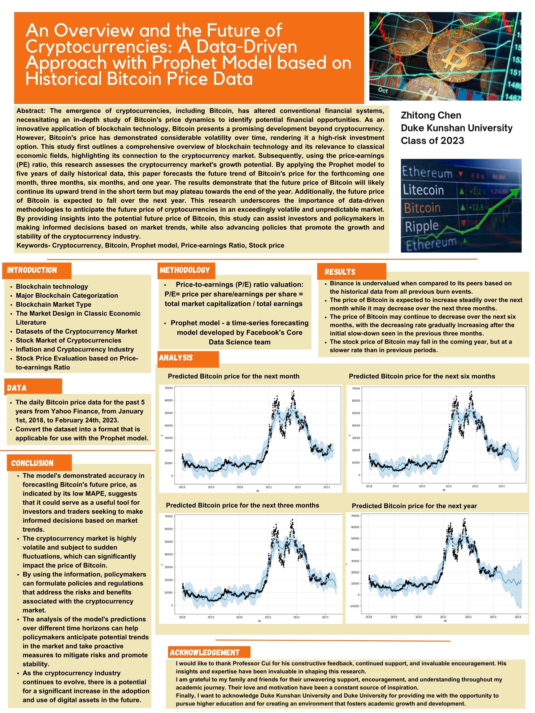 | This study first outlines a comprehensive overview of the concept of blockchain technology, highlighting its relevance to the cryptocurrency market. It discusses how the decentralized and transparent nature of blockchain technology has made it an attractive alternative to traditional financial systems, especially for the cryptocurrency market. This research further provides a review of relevant literature about blockchain and cryptocurrency to establish the context for the research. The literature review explores the development of blockchain technology, the emergence of cryptocurrencies, and their impact on financial markets. Subsequently, using the price-earnings (PE) ratio, this research assesses the cryptocurrency market’s growth potential. By applying the Prophet model to five years of daily historical data, this paper forecasts the future trend of Bitcoin’s price for the forthcoming one month, three months, six months, and one year. The results demonstrate that the future price of Bitcoin will likely continue its upward trend in the short term but may plateau towards the end of the year. Additionally, the future price of Bitcoin is expected to fall over the next year. This research underscores the importance of data-driven methodologies to anticipate the future price of cryptocurrencies in an exceedingly volatile and unpredictable market. By providing insights into the potential future price of Bitcoin, this research can help investors and policymakers make informed decisions based on market trends, while also advancing policies that promote the growth and stability of the cryptocurrency industry. |