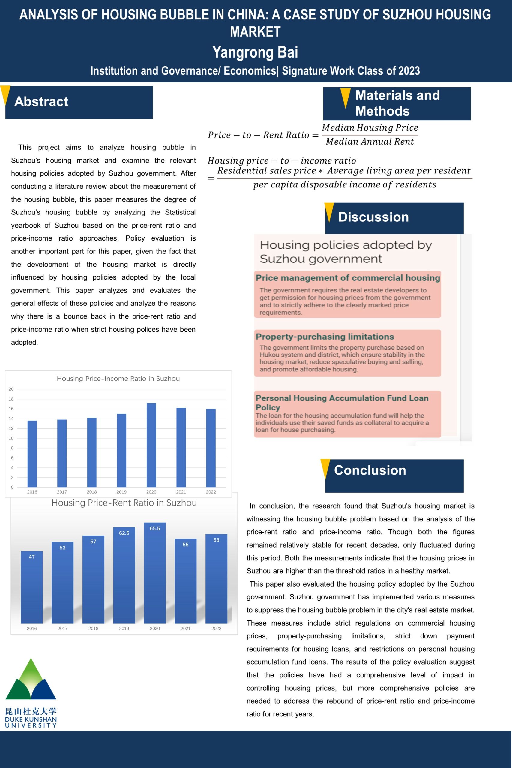 This project aims to analyze housing bubble in Suzhou’s housing market and examine the relevant housing policies adopted by Suzhou government. After conducting a literature review about the measurement of the housing bubble, this paper measures the degree of Suzhou’s housing bubble by analyzing the Statistical yearbook of Suzhou based on the price-rent ratio and price-income ratio approaches. Policy evaluation is another important part for this paper, given the fact that the development of the housing market is directly influenced by housing policies adopted by the local government. Housing policies adopted by the Suzhou government to tackle the issues related to housing bubble include the general housing price control policy and buying restriction. This paper analyzes and evaluates the general effects of these policies and analyze the reasons why there is a bounce back in the price-rent ratio and price-income ratio when strict housing polices have been adopted.