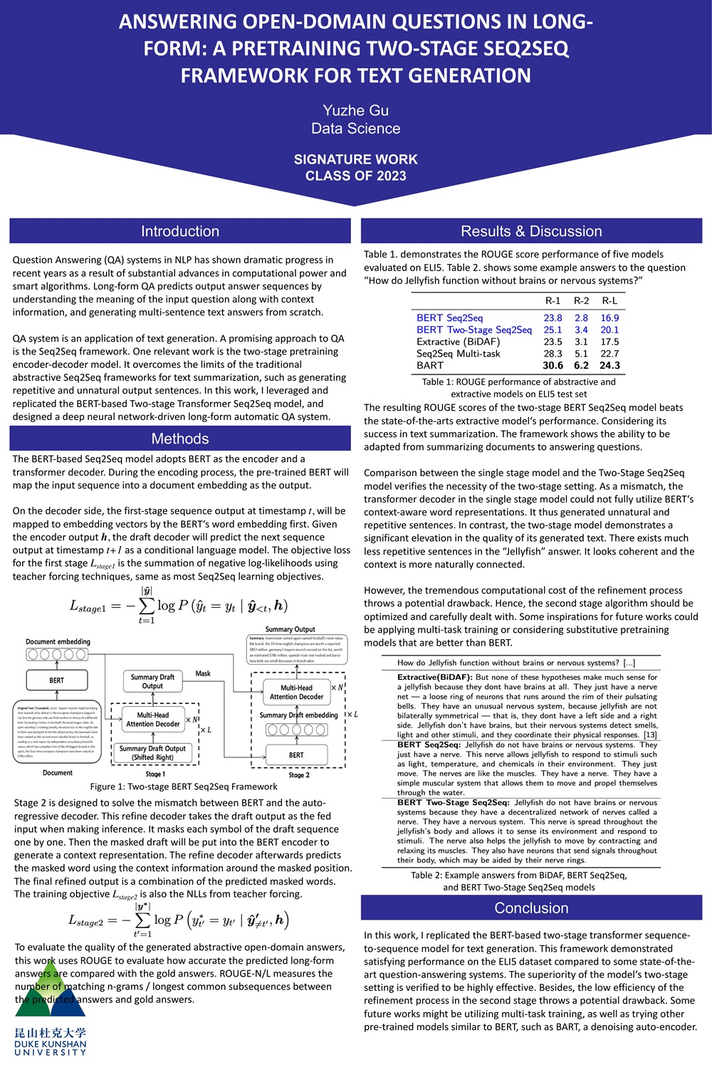 | In this work, I replicated the BERT-based two-stage transformer sequence-to- sequence model for text generation. Although the original work focuses on text summarization, I successfully adapted this framework into the domain of long-form question answering. This framework demonstrated satisfying performance on the ELI5 dataset compared to some state-of-the-art question-answering systems. The superiority of the model’s two-stage setting is verified to be highly effective. Besides, the low efficiency of the refinement process in the second stage throws a potential drawback of this framework. Inspired by relevant successes in question answering, some future works might be utilizing multi-task training, as well as trying other pre-trained models similar to BERT. |