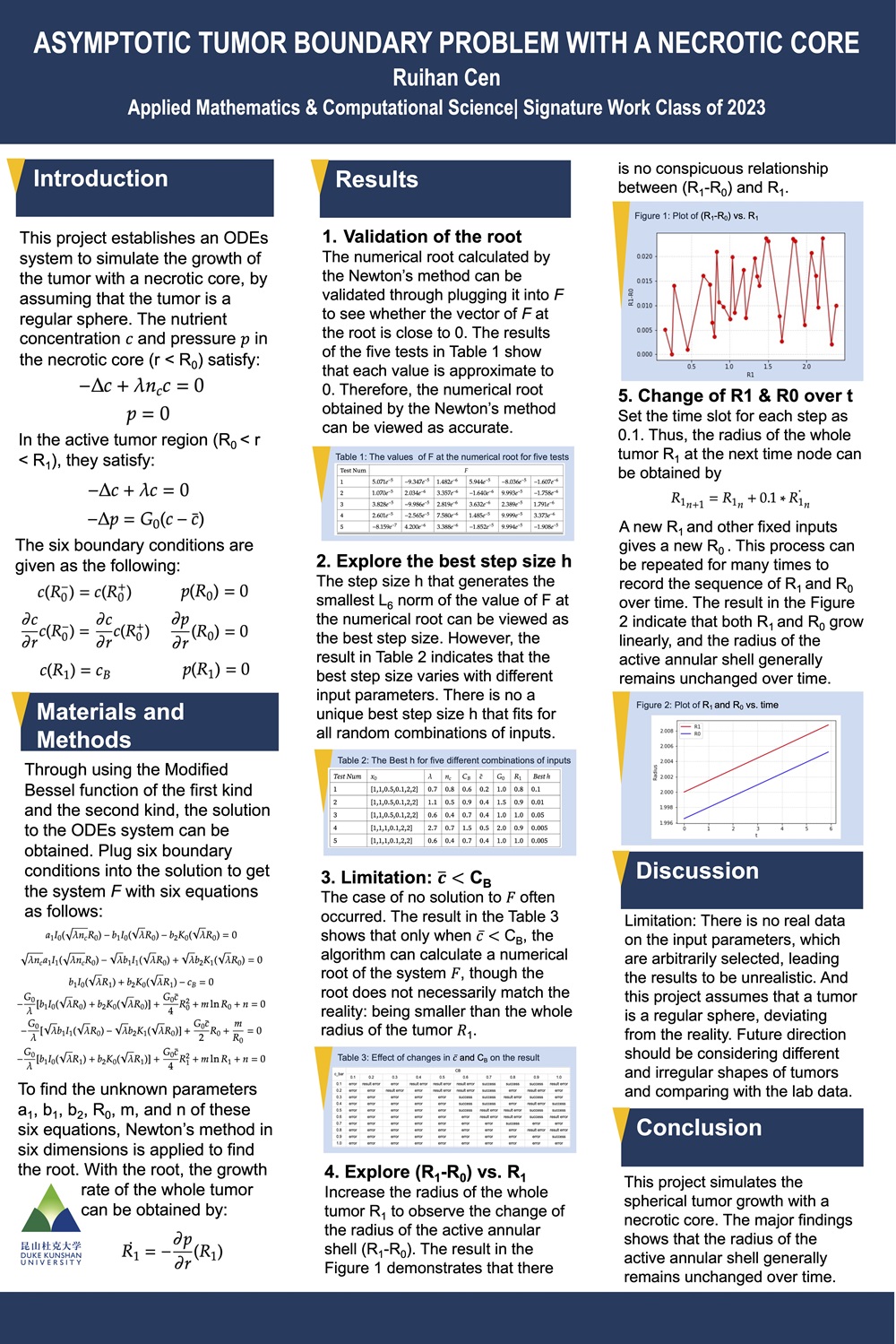 My signature work project is to explore the asymptotic tumor boundary problem with a necrotic core, by establishing a mathematical model to simulate its growth. It is simplified from a partial differential equation system to an ordinary differential equation system by assuming the tumor as a regular sphere. Through using the Modified Bessel function of the first kind and the second kind, the solution to the ODEs can be obtained. After plugging the boundary conditions into the solution, six equations are obtained with the aim of finding their root. Then, Newton’s method in six dimensions is applied to generate a numerical solution. With a numerical root, the growth trend and the characteristics of the tumor can be studied.