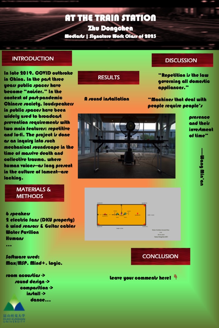 At the Train Station is a sound installation. It is designed to be interactive, immersive, and stimulative, which invites people to join the nexus of sound, olfactory, tactility, and movement. The artists hope to have conversations with the audience on personal memory and collective trauma.