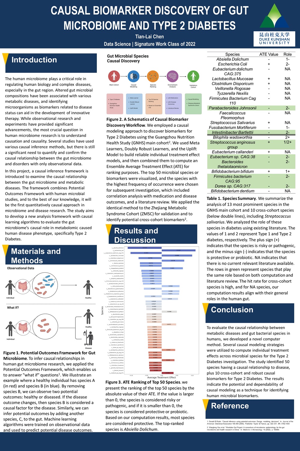 This study aims to establish a novel computational framework for determining causal relationships between human gut microbial species and metabolic diseases, with a focus on Type 2 Diabetes. The research offers a comprehensive review of existing correlation studies, emphasizing the distinction between causal inference and correlation analyses. By applying the Potential Outcomes Framework, we develop an innovative, quantitatively causal pipeline that relies solely on observational data, specifically relative abundance. The Guangzhou Nutrition Health Study serves as the main cohort, while the Zhejiang Metabolic Syndrome Cohort acts as a validation cohort. Models such as Meta Learner, Doubly Robust Learner, and Uplift Model are employed to estimate Individual Treatment Effects. Average Treatment Effect is utilized for ranking purposes. Our findings reveal the top 50 microbial species with strong causal associations to Type 2 Diabetes, demonstrating that over 50% of these species exhibit both causal and correlated connections to the disease. Further downstream analyses of disease outcomes and medication support the relationships between top species and diabetes. A literature review confirms that our computational results align with the general roles of most prominent species in the human gut. Additionally, we identify 10 cross-cohort species that play consistent roles in both our computational findings and previous research. The significance of this study lies in the development of a new analysis pipeline that employs a causal model to assess the gut microbiome in metabolic-driven human disease phenotypes, laying the groundwork for future research in this area.