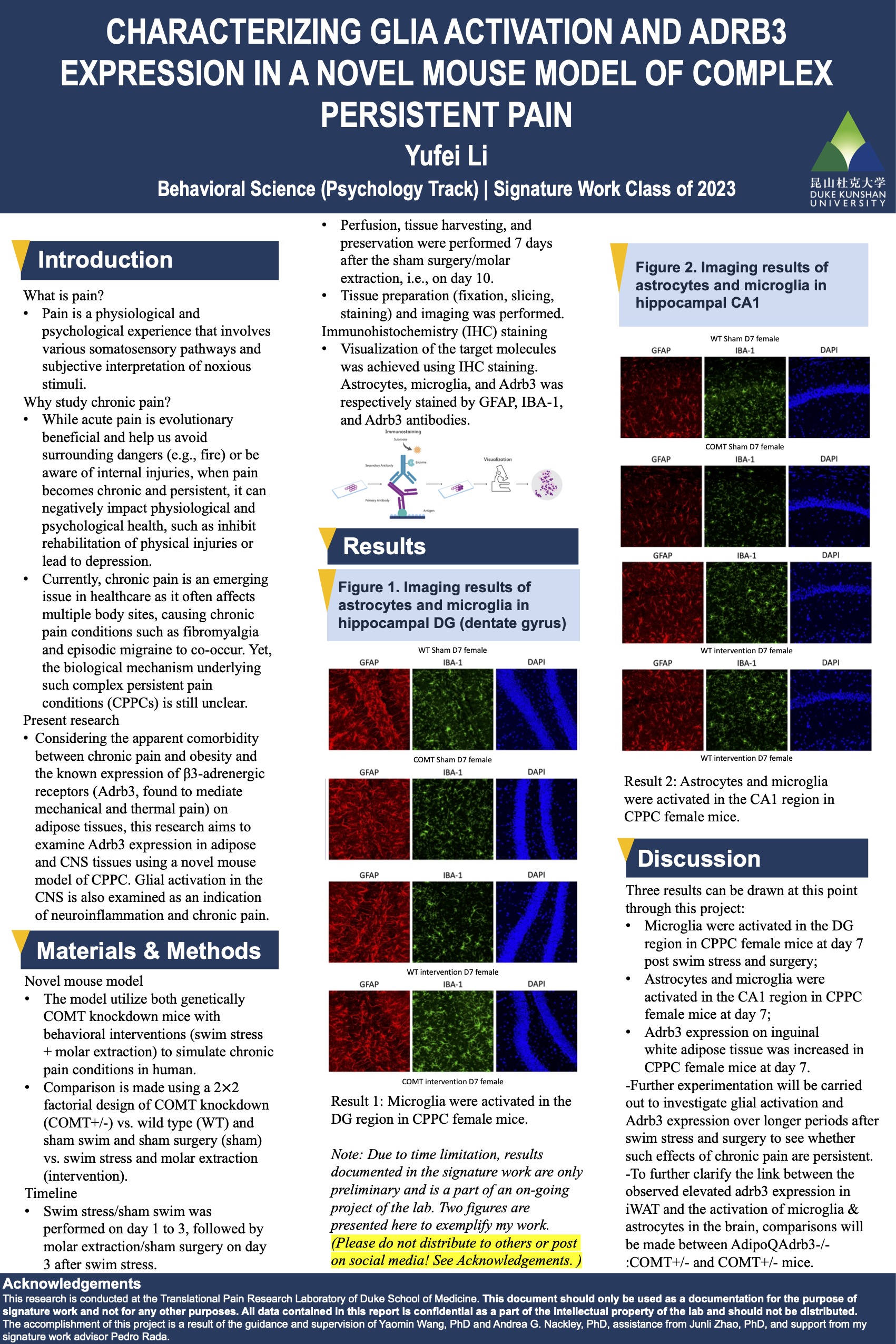 My SW project is about exploring the connection between adipose tissues and chronic pain conditions. To be specific, I investigated the glia activation and Adrb3 expression using a novel mouse model of complex persistent pain conditions (CPPCs). CPPCs are persistent and physiologically and psychologically harmful. Yet, the pathobiology of CPPCs is still largely unclear, which constrains the development of effective treatments. The purpose of this project is to contribute to the collective effort to clarify the pathobiology of chronic pain conditions. Using immunohistochemistry (IHC) staining, this study investigates the biological connections between obesity and CPPCs based on prior findings that β3-adrenergic receptors (β_3Ars), which mediate mechanical and thermal pain, are located mainly in the adipose tissues. The expression of the Adrb3 gene on inguinal white adipose tissues (iWAT) was measured together with glial activation as an indicator of neuroinflammation using a novel mouse model of CPPCs. Current results show an elevation in the expression of iWAT Adrb3 as well as glial activation in CPPC female mice 7 days post swim stress and molar extraction compared to control groups, indicating that iWAT Adrb3 expression contributes to the mediation of pain pathway under chronic pain conditions.