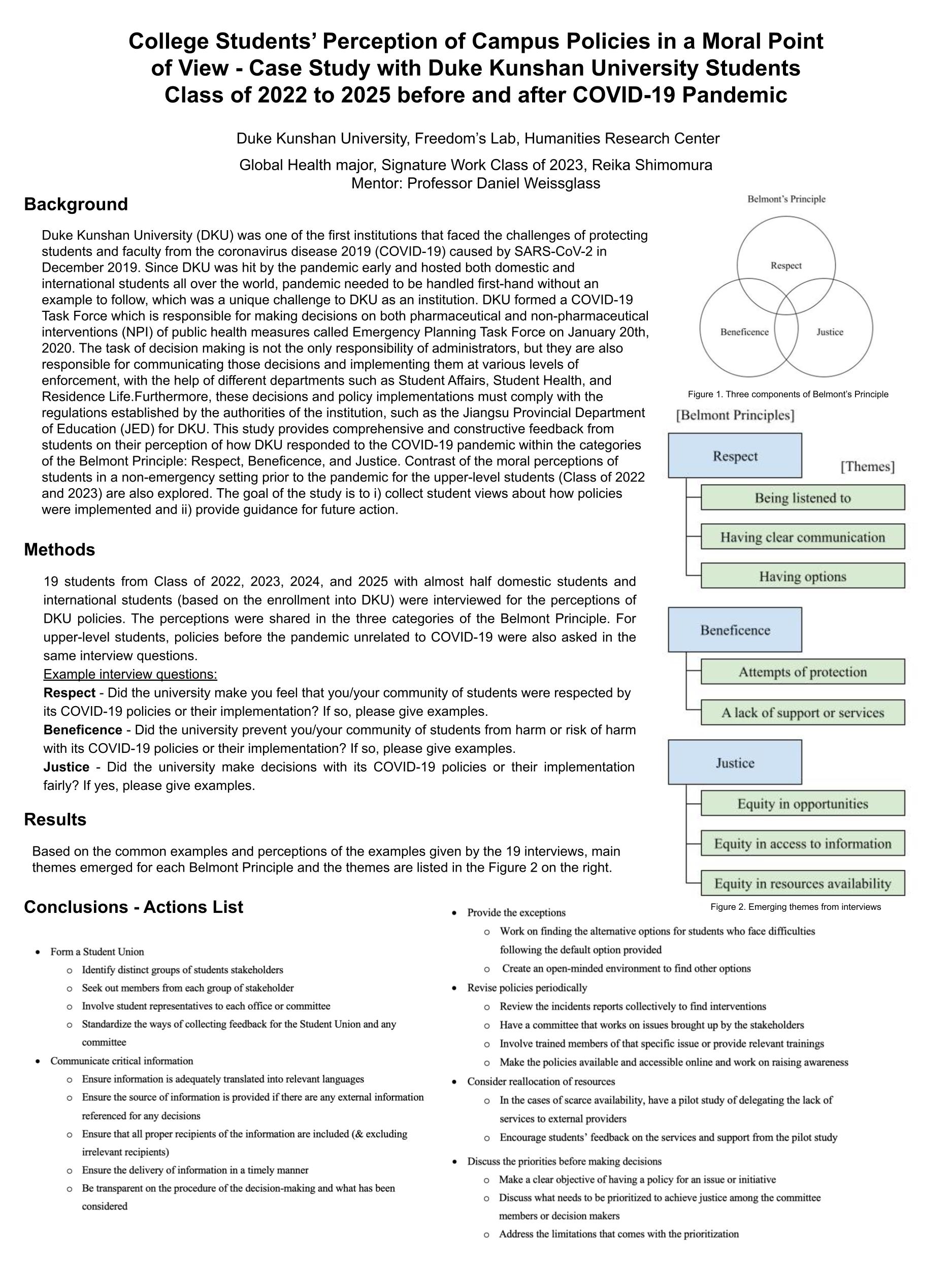 This research discusses how Duke Kunshan University (DKU) handled the challenges of the COVID-19 pandemic and the policies implemented to protect DKU community from students’ perspectives. Both before and after COVID-19 time are considered for policy implementations’ analysis with the ethical framework of the Belmont Principles of Respect, Beneficence, and Justice. Interviews were conducted with 19 students to collect students’ views about how the policies affected the students in the three aspects of Belmont Principles. Based on the interviews, the common themes for respect aspect were being listened to, having lucid communication, and having options. Themes for Beneficence were attempts at protection and a lack of support and services. Themes for Justice were equity in opportunities, access to information, and resource availability. The action list was created to guide the policymakers in the future to have policies implemented that are respective, protect from harm, and be fair to the students.