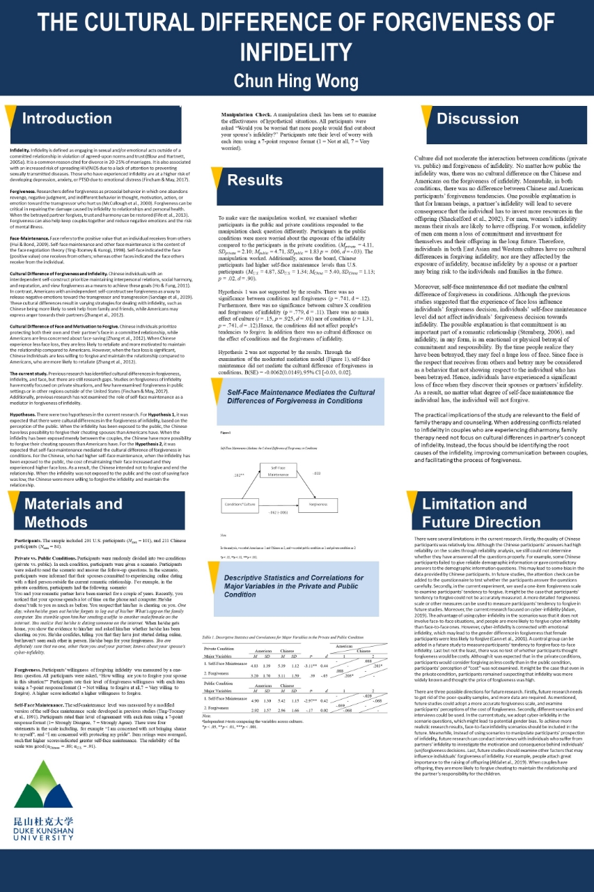 The current study raised two hypotheses. It was expected that culture had a moderator effect on the publicity of infidelity (private vs. public conditions) and forgiveness. Moreover, it was expected that self-face maintenance had a mediation effect mediator effect on the cultural difference in the publicity of infidelity and forgiveness. However, the hypotheses were not supported by the current experiment. The results showed that, regardless of culture and the publicity of infidelity, people were less willing to forgive cheating behavior. It was reasonable to think that people regard infidelity as a great moral hazard and are reluctant to forgive it because they considered it a great risk to the individual and the family. Meanwhile, the results also suggested that self-face maintenance did not serve as a mediator. One possible explanation was that regardless of the publicity of infidelity, it would cost an individual a lot to forgive the infidelity. Hence, individuals were not likely to forgive and probably tend to end up the relationship.