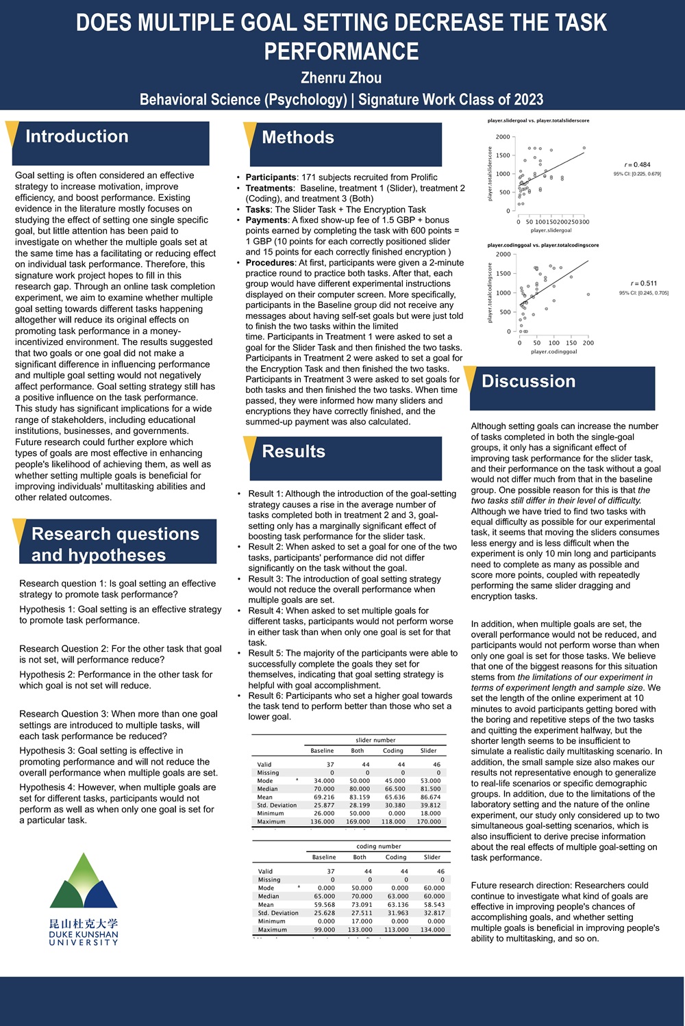 | Goal setting is often considered an effective strategy to increase motivation, improve efficiency, and boost performance. Existing evidence in the literature mostly focuses on studying the effect of setting one single specific goal, but little attention has been paid to investigate on whether multiple goals set at the same time has a facilitating or reducing effect on individual task performance. Therefore, this signature work project hopes to fill in this research gap. Through an online task completion experiment, we aim to examine whether multiple goal setting towards different tasks happening altogether will reduce the original effects of single goal on promoting task performance in a money-incentivized environment. The results suggested that two goals or one goal would not have a significant difference in influencing performance and multiple goal setting would not negatively affect performance. The multiple goal setting strategy still has a positive influence on the task performance. This study has significant implications for a wide range of stakeholders, including educational institutions, businesses, and governments. Future research could further explore which types of goals are most effective in enhancing people’s likelihood of achieving them, as well as whether setting multiple goals is beneficial for improving individuals’ multitasking abilities and other related outcomes. |
