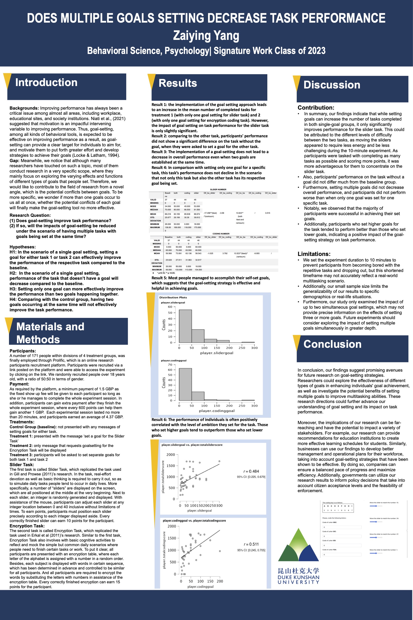 Our research has the importance of improving performance and the effectiveness of goal-setting in motivating individuals to achieve their goals. Recent research suggests that motivation is a significant factor in improving performance. However, the potential conflicts between multiple goals have not been explored. Our research aims to examine whether setting multiple goals towards different tasks at the same time will minimize the original effects of promoting people’s performance in a money-incentivized environment. An RCT lab experiment with four groups was carried out, and the results showed that setting a single goal is effective in improving the performance of the slider task, but not the encryption task. Setting two goals at the same time did not reduce the positive effects of single goal-setting.