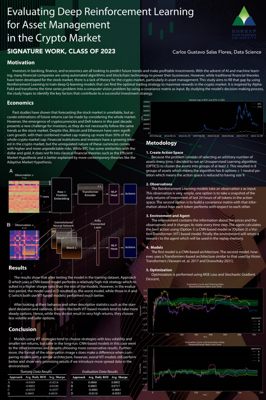 | This project evaluates two different Deep Learning models for Asset Management using Deep Reinforcement Learning. While it’s been shown that predicting the market is unreliable, there are still indicators that can produce accurate descriptions of the future trends of assets in the Stock Market. However, new forms of assets such as cryptocurrencies and Defi tokens pose a new challenge for investors and a unique opportunity for higher-risk strategies. Furthermore, little research is done in the High-Frequency market. The goal is to test approaching the problem as a Computer Vision problem instead and using only the most fundamental elements of Q-learning and Vision Transformers in order to train a model to trade in the High-Frequency Trading crypto market and unveil its strategies. This project also tests state-of-the-art computer vision algorithms (Vision Transformers) against traditional Convolutional Neural Networks. I found that Vision Transformers tend to perform better in the evaluation dataset compared to CNNs and also take less volatile strategies, contrary to CNN-based models which either take high-risk or very neutral strategies. |