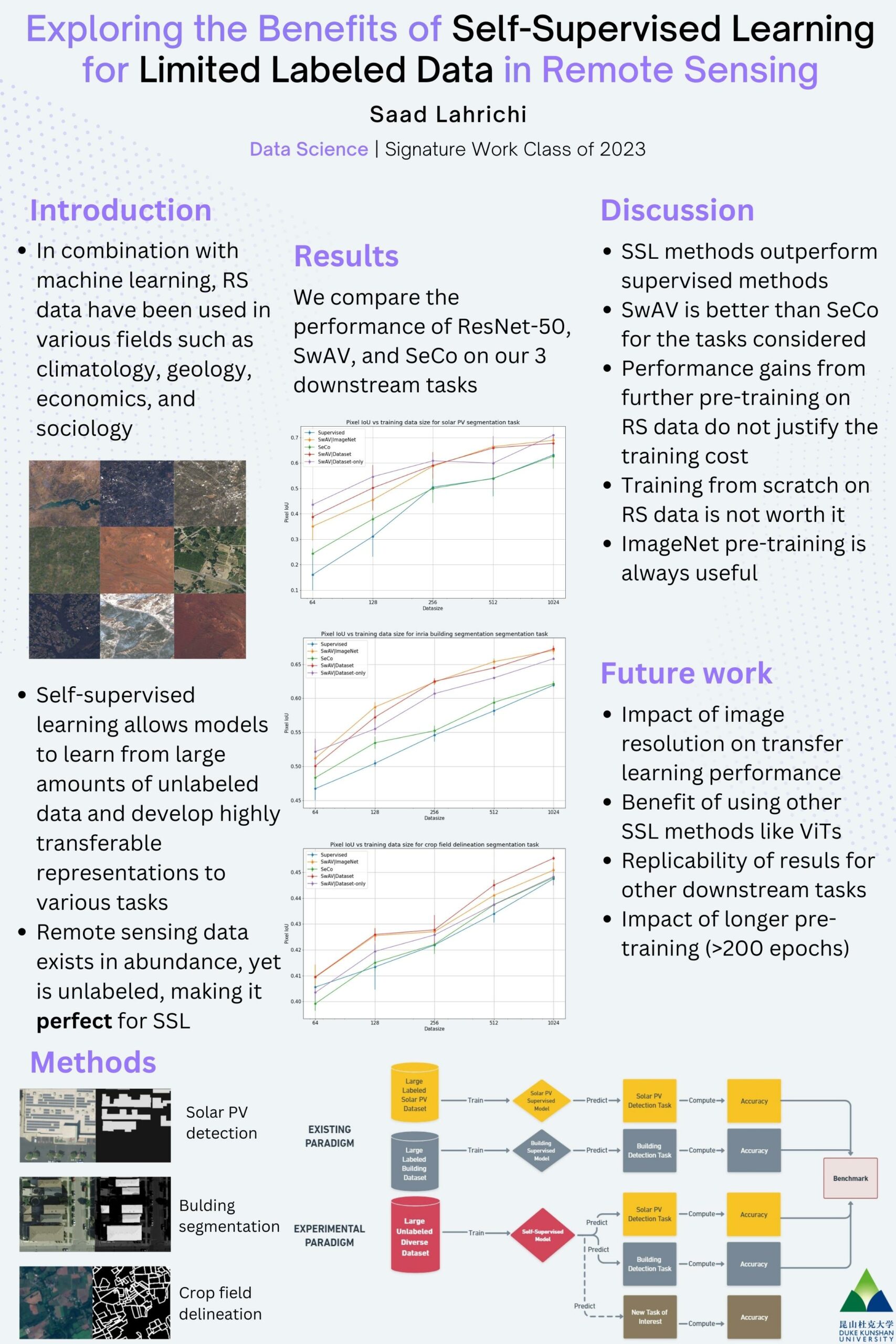 Remote sensing imagery provides a wealth of data that can be used by decision- and policy-makers to mitigate climate change consequences. Self-supervised learning offers the possibility of building meaningful representations from these images by learning to map the representations of similar images (artificially, geographically, temporally) closer to each other, while further from negative pairs. These representations can be used in turn in transfer learning to solve various downstream tasks with low training data and high accuracy which rivals and even surpasses that achieved by fully supervised methods. Given the increased ease of access to free, public remote sensing imagery, and the developments in self-supervised learning, this Signature Work Project explores the benefits of using self-supervision for limited labeled remote sensing data. We achieve this goal by creating a new remote sensing dataset and experimenting with pre-training various models with ImageNet, our model, or both. Our findings support previous research’s conclusions that self-supervision can effectively replace supervised techniques. We also find that SwAV pretrained on ImageNet only provides stellar performance on our three considered downstream tasks (solar PV detection, building segmentation, and crop field delineation) and that further pre-training on a remote sensing dataset improves performance only slightly, which does not warrant the additional effort in collecting the dataset and training on it too. These findings can inform practitioners of the best strategies to maximize the performance of self-supervised models for remote sensing data, which would allow for robust insights about the climate.