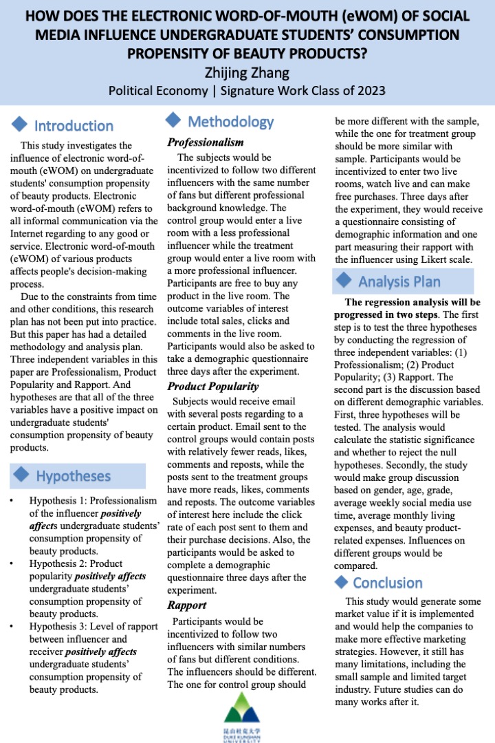 | This study investigates the influence of electronic word-of-mouth (eWOM) on undergraduate students’ consumption propensity of beauty products. Electronic word-of-mouth (eWOM) of various products affects people’s decision-making process. This paper hopes to provide more references for the market in the use of social media by designing a credible experiment. Three independent variables in this study are professionalism, product popularity, and rapport. The hypotheses are that all of these three variables would positively affect the consumption propensity. Due to the constraints from both time and budget, the experiments proposed in the paper have not been implemented yet, but this article has completed a detailed experimental plan and has a corresponding experimental analysis method. Electronic word-of-mouth (eWOM) through social media is a powerful marketing tool for beauty products. Enterprises should have more insights into social media so that they can complete marketing efficiently and accurately. This paper contributes to the potential directions of marketing strategies, and also provides more understandings about electronic word-of-mouth (eWOM). |