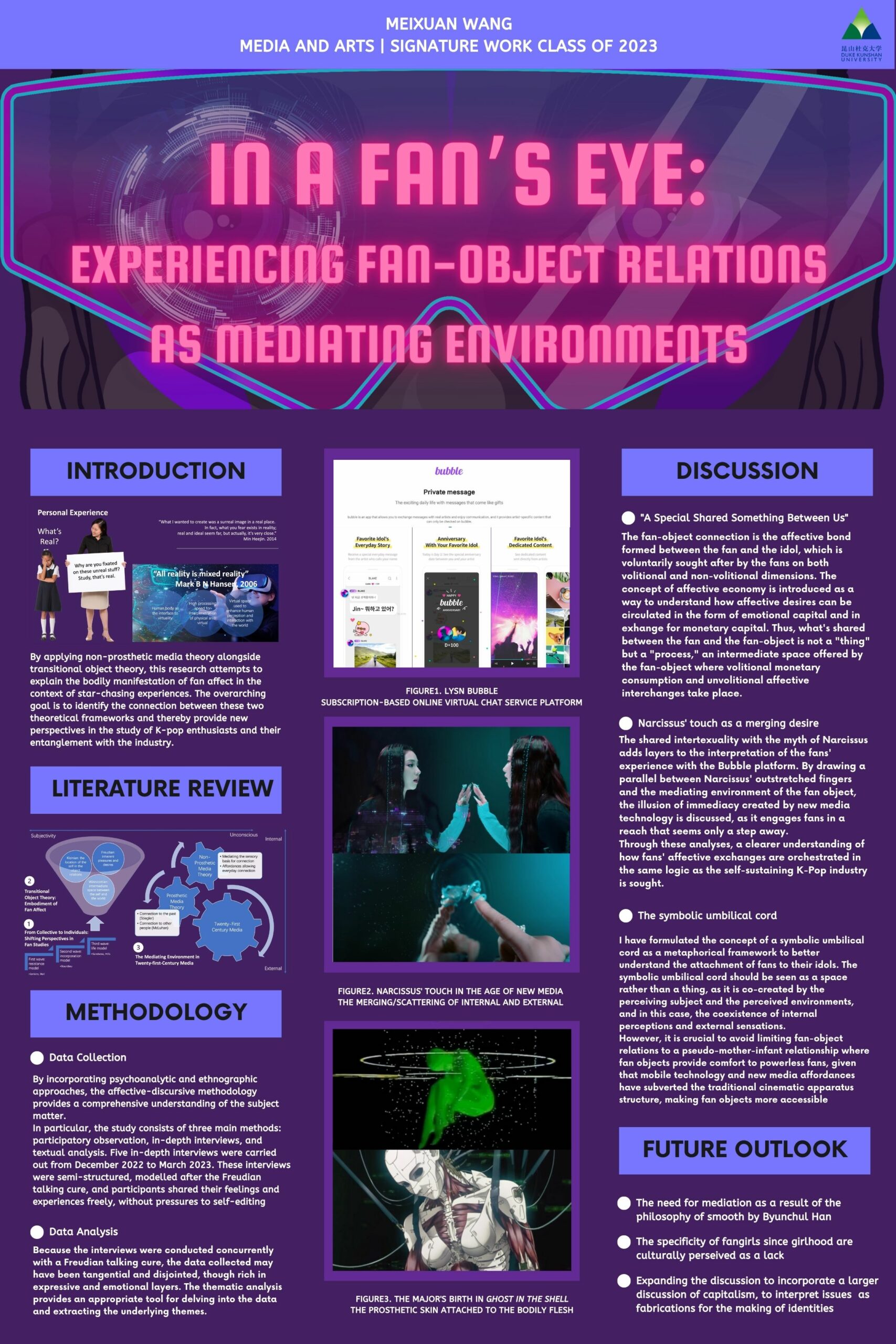 | This paper extends the study of fan-object relations by including embodied fan practices in the environmental media space. Drawing primarily on Hills and Sadvoss’ conceptualization of transitional object theory in fan studies as well as Hansen’s media theory of embodiment, I explore the intersection of these two approaches. In doing so, I argue that individual K-pop fans find themselves in a mediated environment where their fan subjectivities and embodied affectivities converge. Using a multidisciplinary approach that draws on fan studies, psychoanalysis, and media studies, this paper explores the multiple meanings of mediation as it relates to the complex issue of fan affect. Specifically, I analyze how the K-pop industry uses the bodies of idols to disguise its transactional nature and create illusions of exclusivity, intimacy, and approachability. Through a qualitative case study in the subscriptive virtual chat platform Bubble, I develop a symbolic umbilical cord framework that helps illuminate the interdependence between fans and fan objects in relation to the wider world. Ultimately, these discussions aim to unpack the complex interplay between the virtual and the real, the imagined and the lived, the intimate and the public, which is central to the experience of environmental media today. |