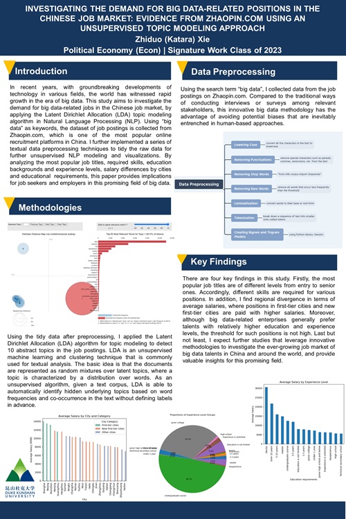 This study aims to investigate the demand for big data-related jobs in the Chinese job market, by applying the Latent Dirichlet Allocation (LDA) topic modeling algorithm in Natural Language Processing (NLP). Using “big data” as keywords, the dataset of job postings is collected from Zhaopin.com, which is one of the most popular online recruitment platforms in China. I further implemented a series of textual data preprocessing techniques to tidy the raw data for further unsupervised NLP modeling and visualizations. By analyzing the most popular job titles, required skills, education backgrounds and experience levels, salary differences by cities and requirements, this paper provides implications for job seekers and employers in this promising field of big data. There are four key findings in this study. Firstly, the most popular job titles are of different levels from entry to senior ones. Accordingly, different skills are required for various positions. In addition, I find regional divergence in terms of average salaries, where positions in first-tier cities and new first-tier cities are paid with higher salaries. Moreover, although big data-related enterprises generally prefer talents with relatively higher education and experience levels, the threshold for such positions is not high. Last but not least, I expect further studies that leverage innovative methodologies to investigate the ever-growing job market of big data talents in China and around the world, and provide valuable insights for this promising field.