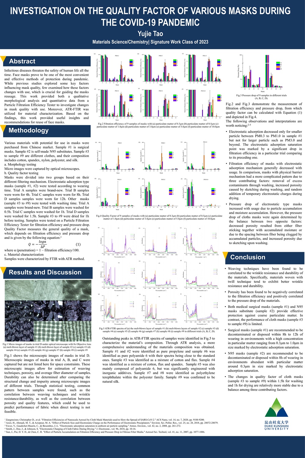 | Previous studies investigated some factors of the face masks quality but few studied their changing patterns with usage, which are significant in guiding the reuse of masks. This work tested three times to supplement more accurate data as references in masks designing. Moreover, this work provided both qualitative morphological analysis with optical microscopes and quantitative professional data on changes in quality factors with a Particle Filtration Efficiency Tester. It also utilized ATR-FTIR for material characterization. Experiments showed that surgical masks should be decontaminated within 8h to 12h exposure to PM0.3 to PM1.0 and N95 masks should be decontaminated within 8h exposure to PM0.3. The quality factor of cloth masks was found limited but their performance within 1.5h of wash and 1h of drying were more stable due to the checks and balances of three opposite factors. On top of it, weaving techniques were found to be correlated to the durability of the masks and porosity were found to be correlated to the quality factor of the masks, which can be convenient parameters in predicting the performance of masks. |