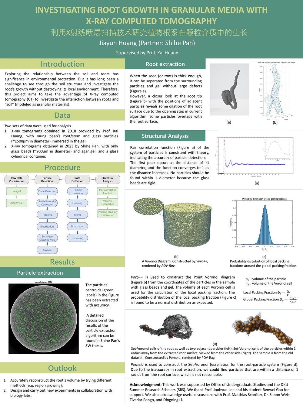 | Interested in the mutual influence between root growth and soil compaction from a biomechanical perspective, this project analyzed the change in root morphology and packing fraction during root growth in a granular medium, using 3D X-ray computed tomography (CT) to visualize the system. Experiments for identifying the optimal parameters for X-ray CT measurement were carried out, providing a systematic method for finding suitable parameters in future experiments. The algorithm for detecting the particles’ positions and extracting the root surface from the tomogram was modified based on previous code in MATLAB. The particle detection algorithm is shown to have nice accuracy, while the root extracting algorithm needs further modification. Voro++ and Pomelo were used to conduct (Set-)Voronoi tessellation of the samples. Packing fractions of the particles and the roots were investigated, as well as the effect of sampling rate on Voronoi tessellation. The sample only with particles and gel has a local packing fraction distribution consistent with the theory. Due to the inaccuracy of the root extraction algorithm, the results for the sample with the root are not robust enough. Nevertheless, the workflow of both imaging and structural analysis can be applied to future data sets of CT scans. |