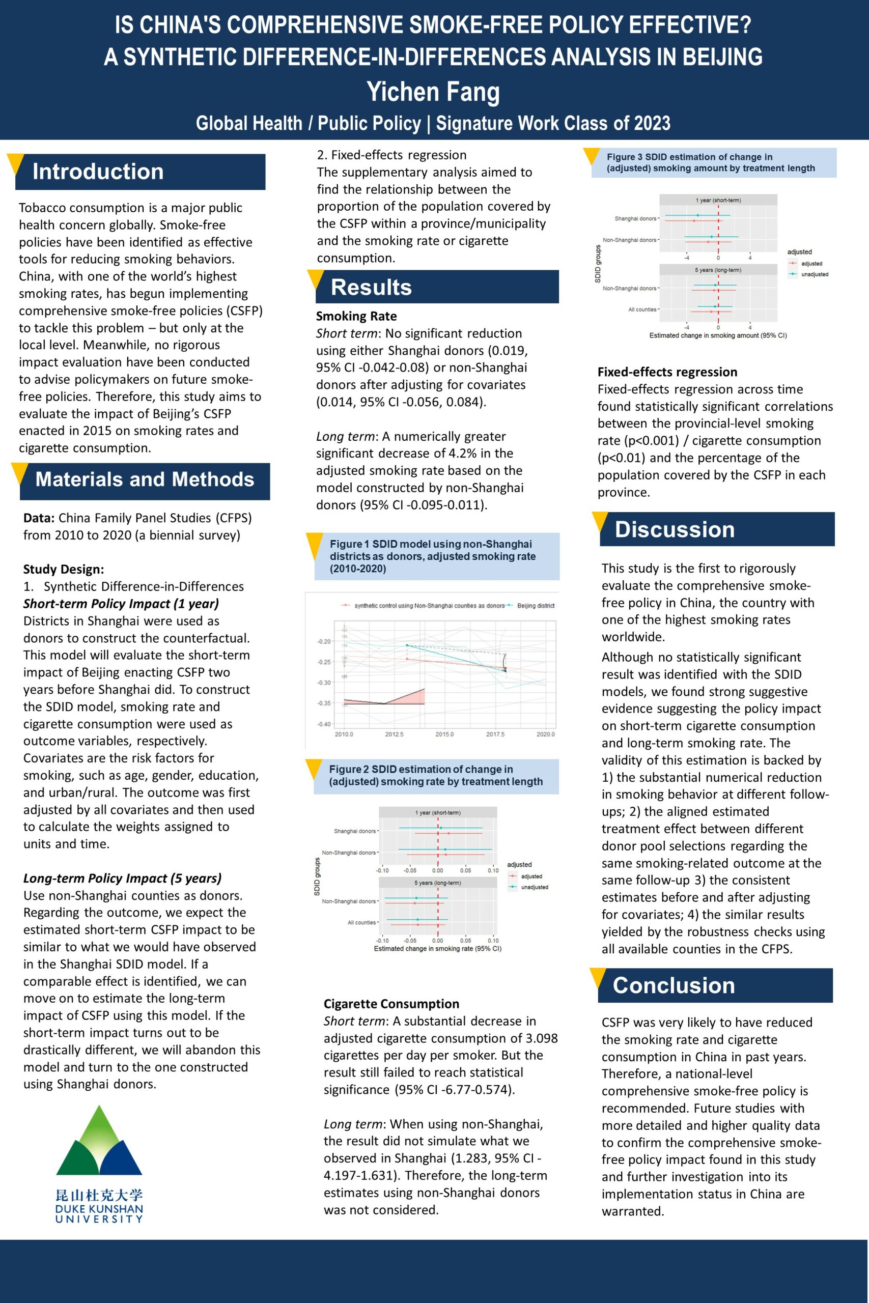 Tobacco consumption is a major public health concern globally. Smoke-free policies have been identified as effective tools for reducing smoking behaviors. China, with one of the world’s highest smoking rates, has begun implementing comprehensive smoke-free policies (CSFP) to tackle this problem – but only at the local level. Meanwhile, no rigorous impact evaluation has been conducted to advise policymakers on future smoke-free policies. Therefore, this study evaluates the impact of Beijing’s CSFP on smoking rates and cigarette consumption using a synthetic difference-in-differences design. Although primary analyses do not yield statistically significant results, we find strong suggestive evidence that the policy yielded a positive impact on reducing short-term cigarette consumption and long-term smoking rates. Varying donor pools and adjusting county-level covariates do not affect our results, bolstering confidence in their validity. Additionally, fixed-effects regression analysis reveals a statistically significant negative correlation between province-level CSFP coverage and smoking rates and cigarette consumption over time, providing solid support. These findings call for a national-level CSFP to improve population health; they also highlight the importance of studying effective policy implementation.