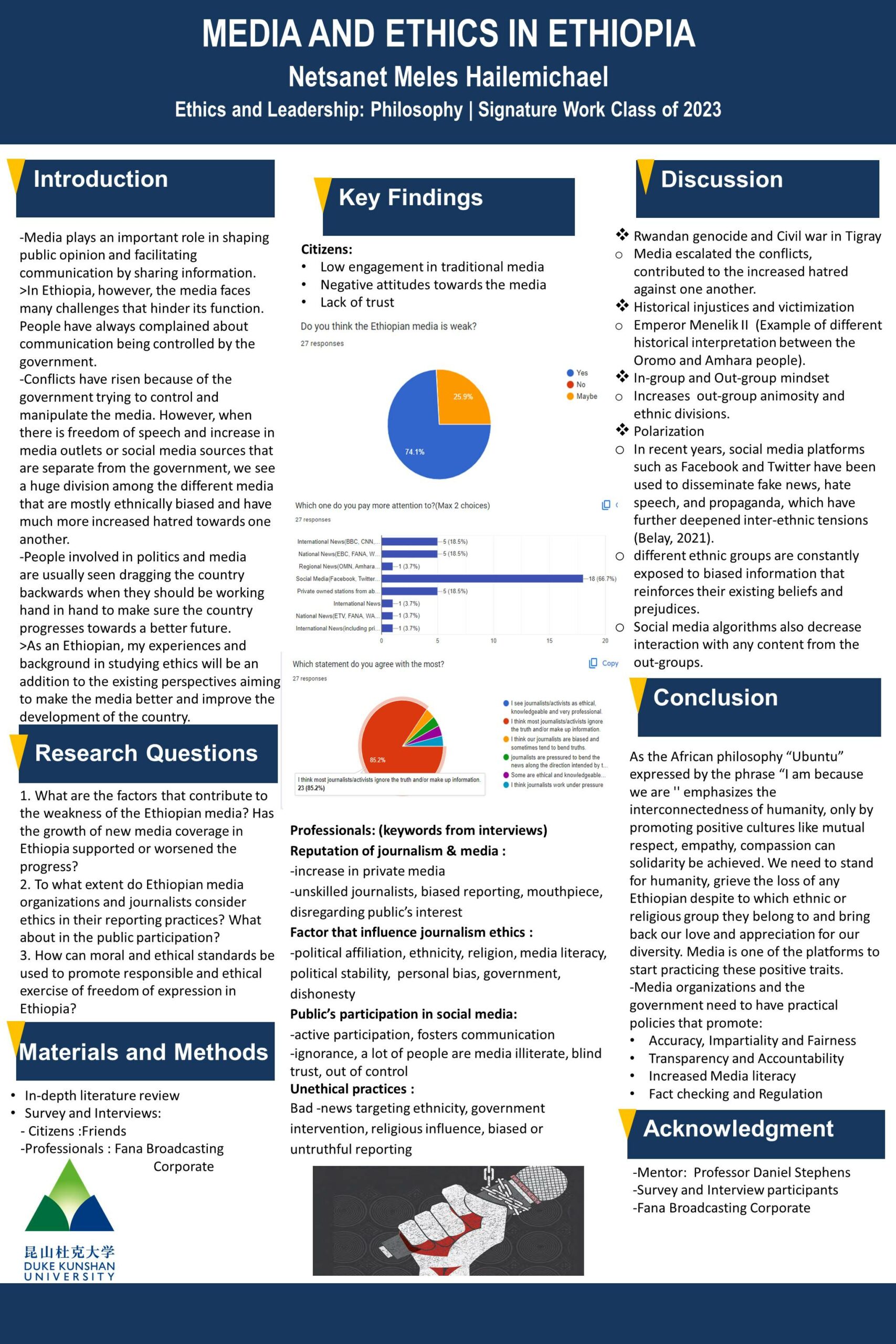 Media plays an important role in shaping public opinion and facilitating communication by sharing information. In Ethiopia, however, the media faces many challenges that hinder its function. People have always complained about communication being controlled by the government. And there are instances where conflicts have risen because of the government trying to control and manipulate the media. However, when there is freedom of speech and increase in media outlets or social media sources that are separate from the government, we see a huge division among the different media that are mostly ethnically biased and have much more increased hatred towards one another. People involved in politics and media are usually seen dragging the country backwards when they should be working hand in hand to make sure the country progresses towards a better future. As an Ethiopian, my experiences and background in studying ethics will be an addition to the existing perspectives aiming to make the media better and improve the development of the country. This research paper aims to explore the factors contributing to the weakness of Ethiopian media, examine the extent to which ethics are considered in media reporting, and discuss the benefits of promoting ethical journalism in Ethiopia.