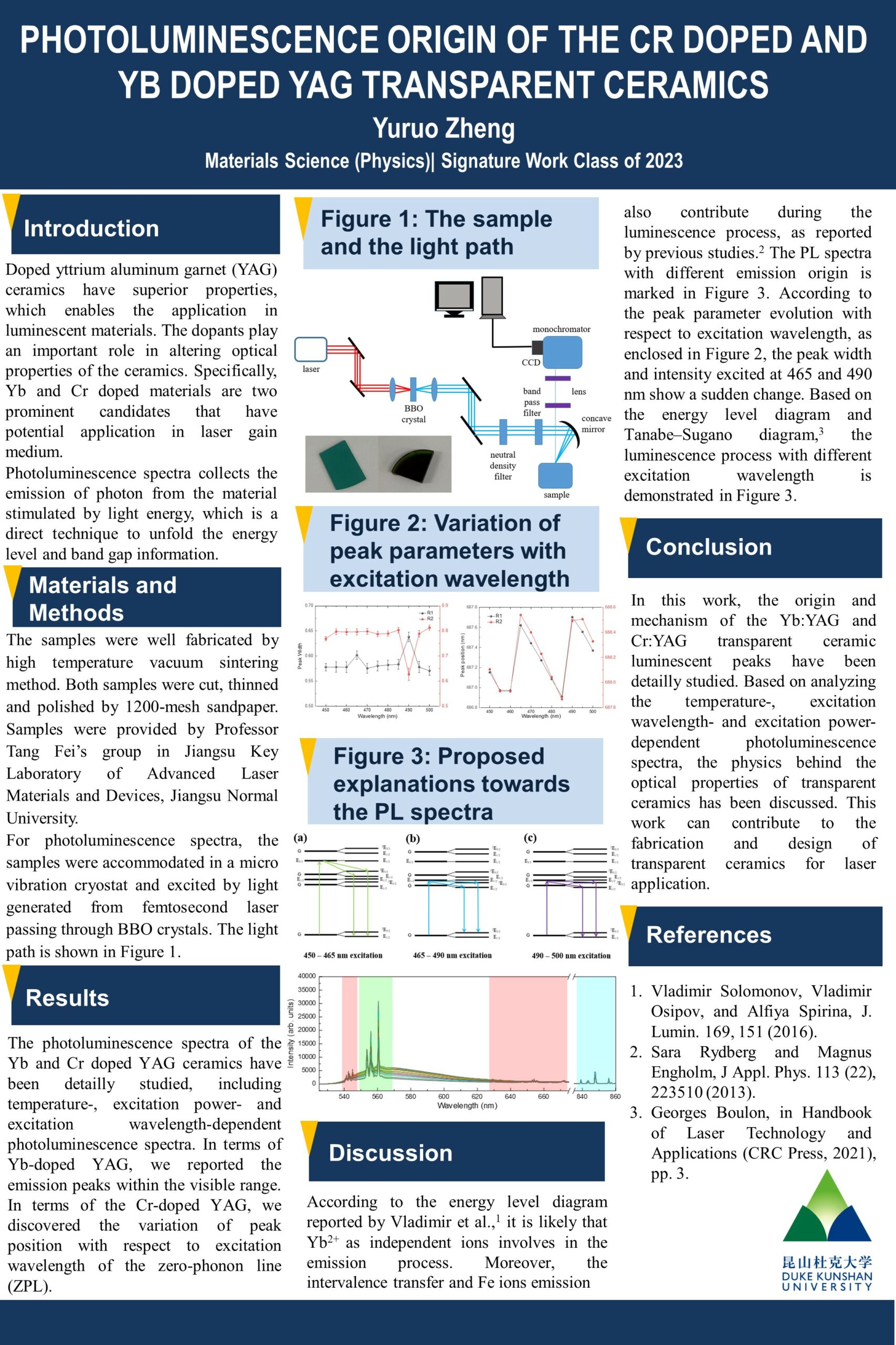 This SW project mainly focused on the optical property characterization of the two Yb and Cr doped YAG transparent ceramics. Specifically, the photoluminescence spectra of the Yb and Cr doped YAG ceramics have been detailly studied, including temperature-, excitation power- and excitation wavelength-dependent photoluminescence spectra. In terms of Yb-doped YAG, this work reported the emission peaks within the visible range and assigned the peaks to be intervalence transfer luminescence, Yb2+ luminescence, and impurity luminescence, respectively. In terms of the Cr-doped YAG, based on the variation of peak position with respect to the excitation wavelength of the zero-phonon line (ZPL), this work proposed that the mechanism of the ZPL emission involves a transition between different energy levels caused by the splitting of the crystal field and spin-orbit coupling. The findings in this work will be beneficial to understanding the emission behavior of the ceramic materials and implementing further applications.