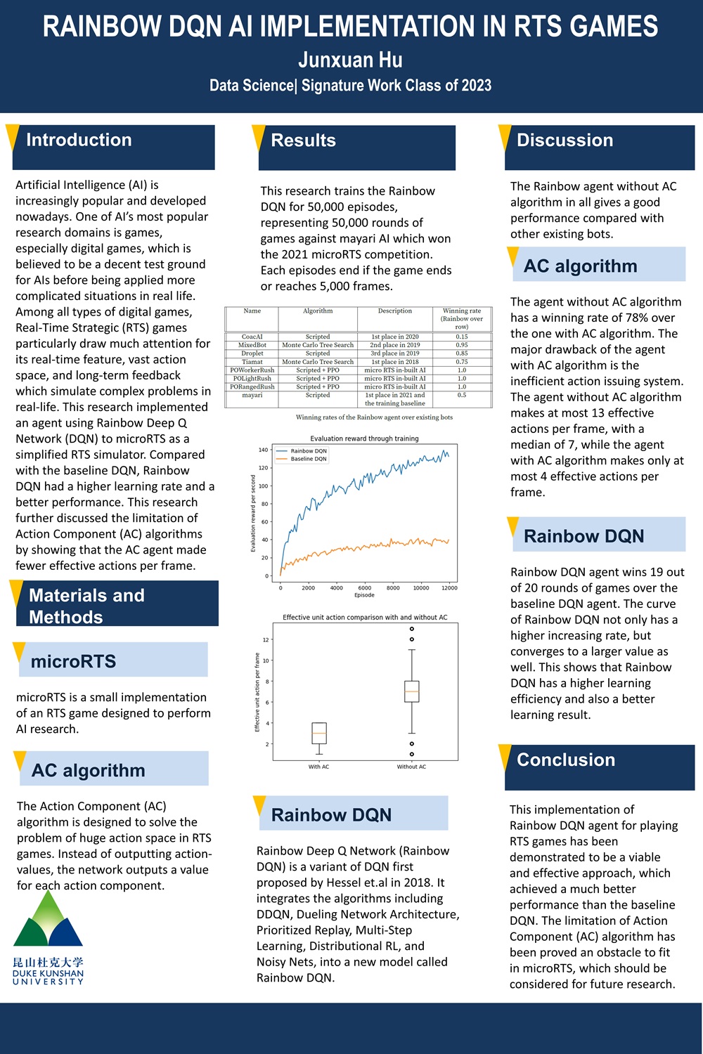 | Game AIs as a test field for advanced AI techniques have been a popular research area. Real-Time Strategic (RTS) games particularly draw much attention for its real-time feature, vast action space, and long-term feedback which simulate complex problems in real-life. This research implemented an agent using Rainbow Deep Q Network (DQN) to microRTS as a simplified RTS simulator. The final agent achieved good performance and won over most award-winning agents with large advantage, which demonstrated Rainbow DQN a viable and effective solution in complex scenarios. Compared with the baseline DQN, Rainbow DQN had a higher learning rate and a better performance. This research further discussed the limitation of Action Component (AC) algorithms by showing that the AC agent made fewer effective actions per frame. This research added to the research conversation by first implementing Rainbow DQN to RTS games and furthering the investigation of AC algorithms, which help future research not only in RTS games but in deep reinforcement learning in complex scenarios as well. |