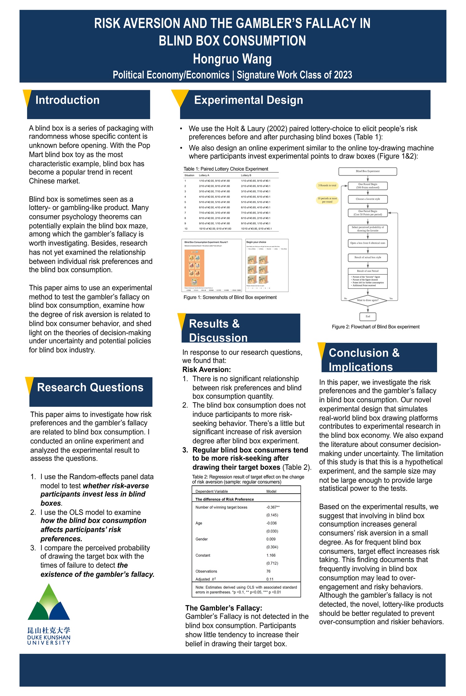 | A blind box is a series of packaging with randomness whose specific content is unknown before opening. With the Pop Mart blind box toy as the most characteristic example, blind box has become a popular trend in recent Chinese market. Blind box is sometimes seen as a lottery- or gambling-like product. To study the underlying behavioral theories about the seemingly impulsive purchase of blind boxes, we experimentally investigate how risk aversion and the gambler’s fallacy are related to blind box consumption. We use the Holt-Laury (2002) paired lottery choice to elicit people’s risk attitudes before and after purchasing blind boxes. We also design an online experiment that simulates the online toy-drawing machine where participants invest experimental points to draw boxes. Based on the experimental results, we suggest that involving in blind box consumption increases general consumers’ risk aversion in a small degree. As for frequent blind box consumers, there is a significant increase of risk taking after drawing target boxes. This finding document that frequently involving in blind box consumption may lead to over-engagement and risky behaviors. Although the gambler’s fallacy is not detected, the novel, lottery-like products should be better regulated to prevent over-consumption and riskier behaviors. The novel experimental design that simulates real-world blind box drawing platforms contributes to experimental research in the blind box economy. We also expand the literature about consumer decision-making under uncertainty. |