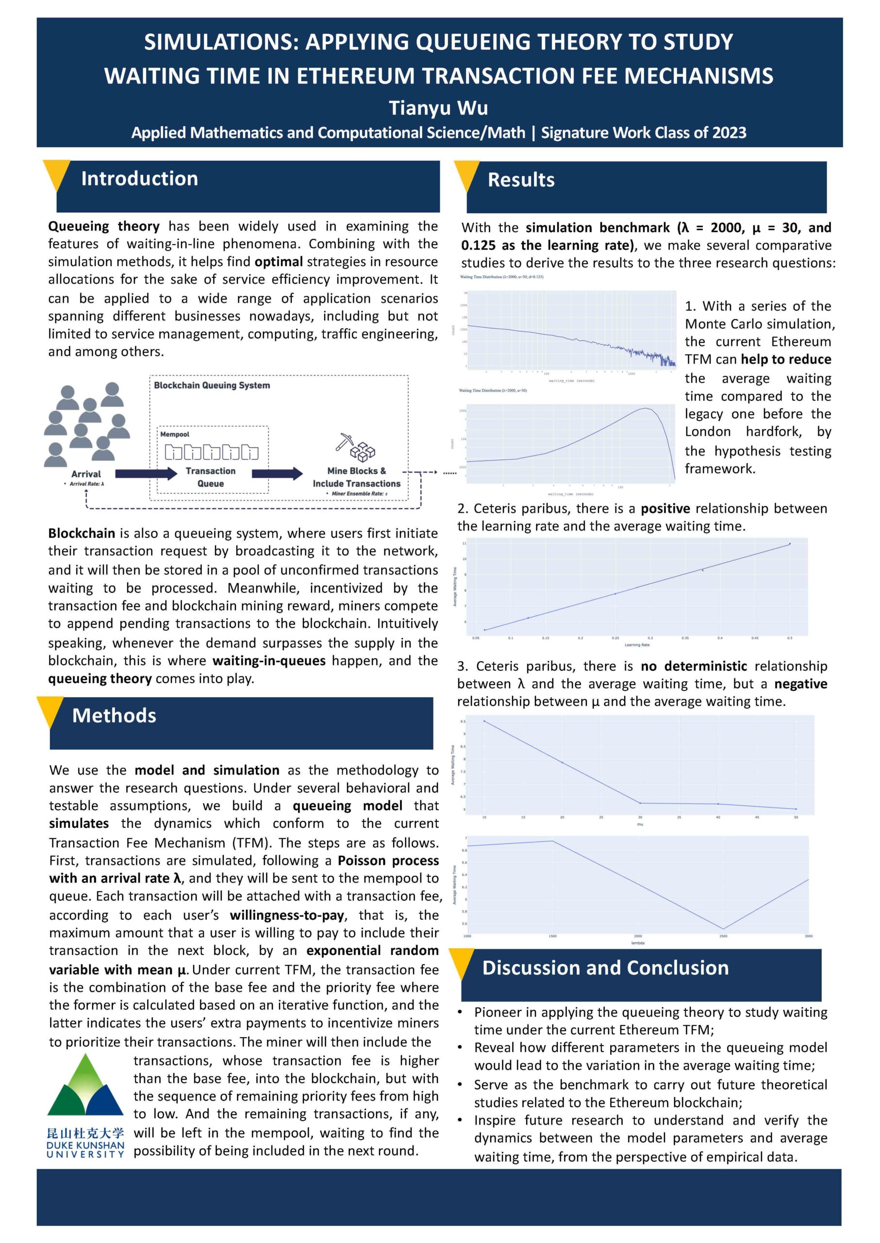 Queueing theory has a history of more than one hundred years. It serves as the foundation for examining the features of waiting-in-line phenomena and can help find optimal strategies in resource allocation for the sake of service efficiency improvement. Queueing theory has wide application scenarios, spanning different industries. With the rapid development of blockchain recently, this SW project aims to apply the queueing theory to understand blockchain dynamics, as blockchain is a decentralized queueing system where transactions are sent to a pool of unconfirmed queues, awaiting to be processed by the miners. However, none of the existing research managed to apply the queueing theory to understand the dynamics of pending transactions in the Ethereum blockchain. In this paper, we build a queueing model based on the current Ethereum Transaction Fee Mechanism (TFM) and manage to reveal that the current Ethereum TFM can help to reduce the average waiting time compared to the legacy one before the London hardfork. Furthermore, our study shows that the average waiting time is positively correlated with the learning rate, specified in the TFM base fee adjustment mechanism, and negatively correlated with users’ willingness to pay, but no deterministic relationship with the transaction arrival rate. Our research also inspires future research to apply queueing theory to optimize the Ethereum TFM through variations of the relevant parameters.