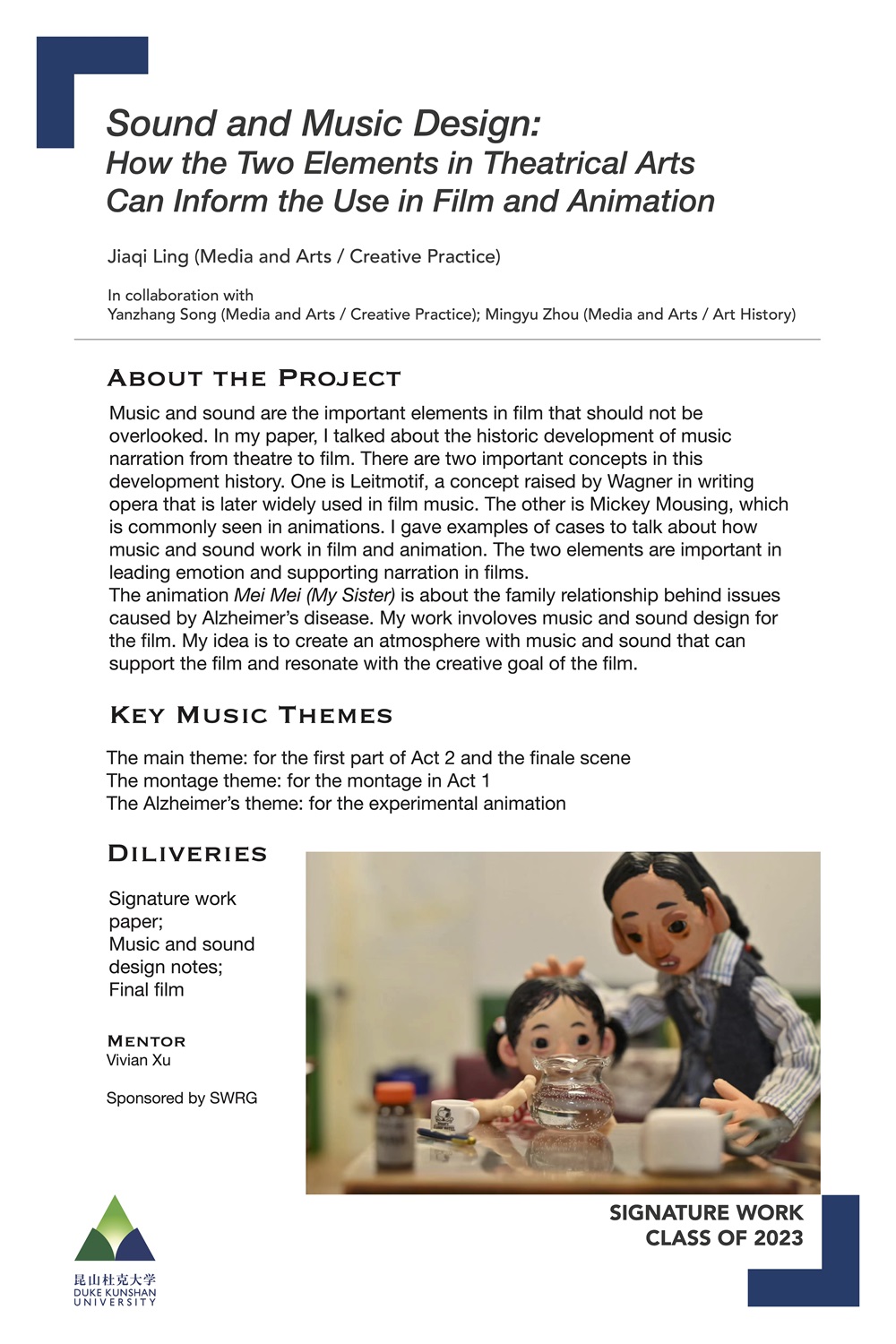 My SW project is about the use of sound and music to narrate stories in film and animation. Having a history in theatrical arts, the use of sound and music should not be overlooked in film production. They are important elements to support the emotions of stories. In my team project animation film Mei Mei (My Sister), I mainly work on music and sound design. The film is about Alzheimer’s disease, so music and sound play an important role in establishing emotions.