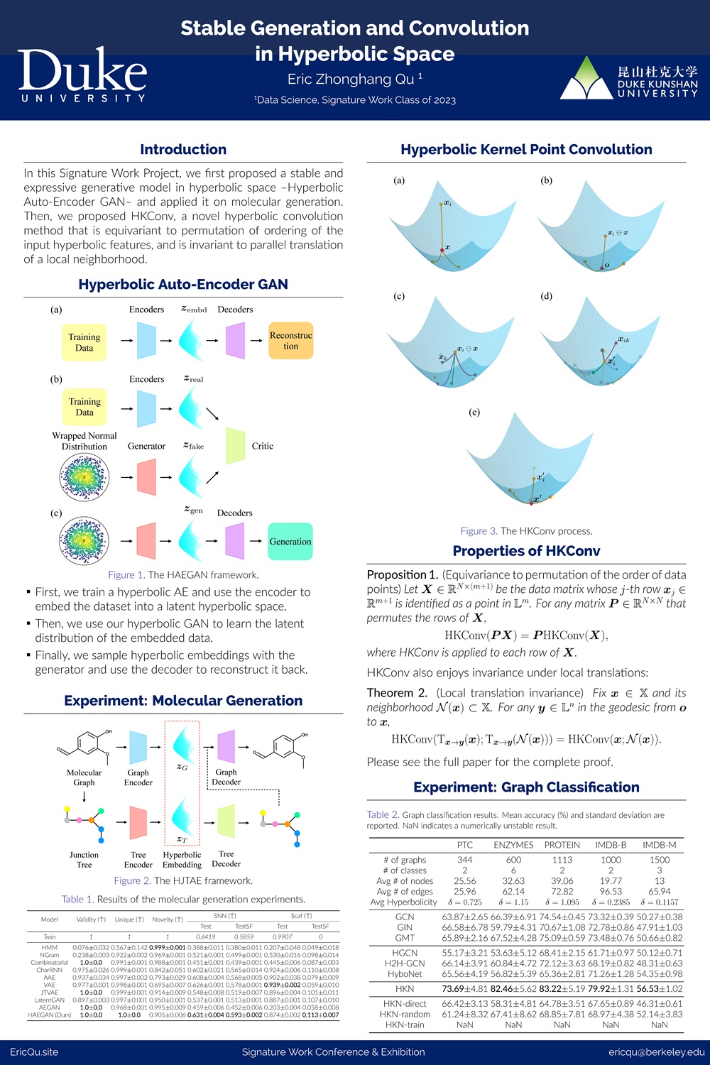 For non-Euclidean data, it is of vital importance to learn representations according to their underlying geometry. Studies have revealed that the hyperbolic space can effectively embed hierarchical or tree-like data. In particular, the few past years have witnessed a rapid development of hyperbolic neural networks. In this Signature Work, we first propose novel architectures and layers in order to improve stability during training of hyperbolic neural networks. The proposed hyperbolic generative network contains an auto-encoder and a generative adversarial network. Our network is designed to foster expressive and numerically stable representations in the hyperbolic space, and it has been proven to be effective in generating both tree-like graphs and complex molecular data with state-of-the-art structure-related performance. Additionally, we propose the HKConv, a novel trainable hyperbolic convolution layer that expresses local features according to the hyperbolic geometry, and is equivariant to permutation of hyperbolic points and invariant to parallel transport of a local neighborhood. Our approach advances state-of-the-art results in various tasks.