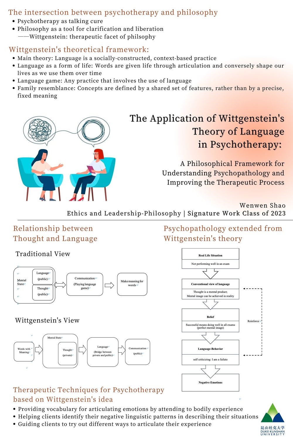 This project is a written thesis that conducts an interdisciplinary study between philosophy and psychology from a linguistic perspective. The specific focus is on the philosophical implication of Wittgenstein’s theory of language on psychotherapy. It mainly provides an overview of Wittgenstein’s theoretical framework, the application of his account on psychopathology, the role of language in various psychotherapy practices, and how Wittgenstein’s idea can inform therapeutic practice.