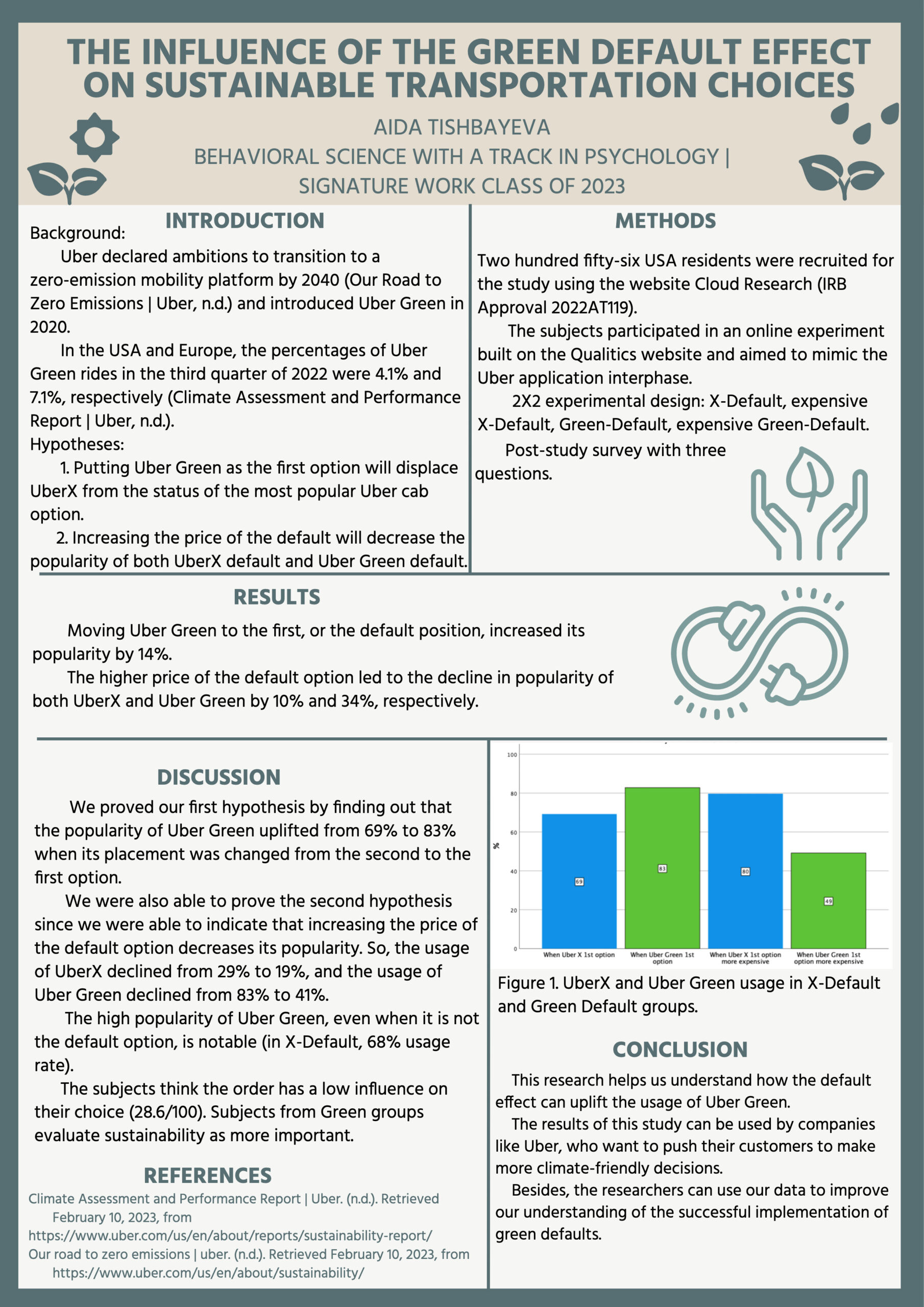 Uber claimed its ambitions to become a carbon-free platform by 2040 and introduced Uber Green, electric and hybrid cab options, in 2020. Despite all the effort, only 1.35% of all Uber rides globally were made by Uber Green cabs. We hypothesized that the reason behind that is possibly the default effect, the tendency to choose the first option in the presence of others. To test our hypothesis, we conducted an online experiment (n=256) where the subjects were in the four study groups: X-Default, Green-Default, expensive X-Default, and expensive Green-Default. The first two had UberX and Uber Green as the default options with no price difference, and the latter had UberX and Uber Green as the more expensive default options. As a result of the study, we determined that shifting Uber Green from the second position to the first one increased its popularity by 14%. Besides, making the default more expensive decreases UberX and Uber Green usage by 10% and 34%, respectively. The post-experimental survey showed that people underestimated the effect of the order on their choices (28.6/100). Besides, it displayed that belonging to the Green-Default and expensive Green-Default groups increased the subject’s perception of the significance of sustainability in different spheres of life, not limited to transportation. The results of our study can be used by Uber and other companies that want to promote sustainable consumption. Additionally, the researchers can use our data to improve further our understanding of using green default effect nudges.