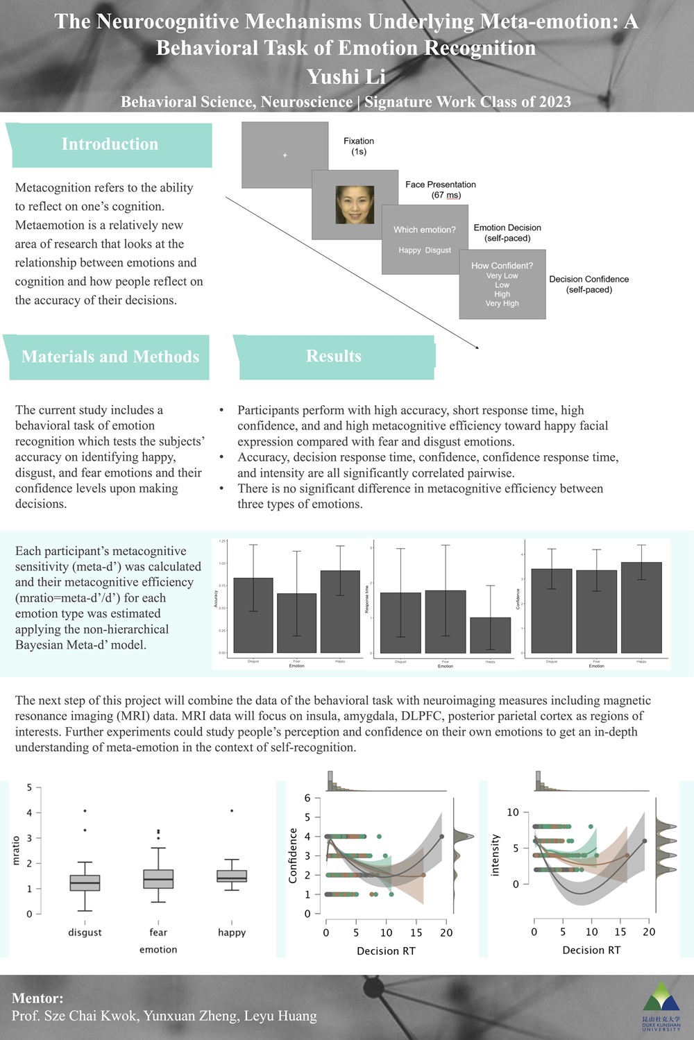 Metacognition refers to the ability to reflect on one’s cognition. It contributes to the process of “knowing what we know” when we reflect on our perception of a concept. Metaemotion is a relatively new area of research that looks at the relationship between emotions and cognition and how people reflect on the accuracy of their decisions. The current study includes a behavioral task of emotion recognition which tests the subjects’ accuracy in identifying happy, disgust, and fear facial expressions and their confidence levels upon making decisions.