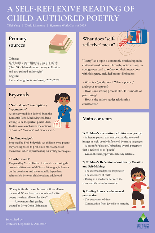 Young poets and child-authored poetry are often regarded as “mysterious” and “spontaneous” in the Romantic literary tradition, and such a myth continues to influence the circulation of child-authored poems in a crosscultural context. The proponents of children’s spontaneity often associate their poetry writing with a desire for “self-expression”, namely the autonomous revelations of children’s inner worlds. By contrast, this paper argues that the assumption on spontaneity shows a certain degree of inconsistency, for the emphasis on “nature” and the external “secrets of the universe” contradicts with the culturally embedded development of the “self”. Based on Myra Cohn Livingston’s observation on the historical construction of the “natural poet” myth and Fred Sedgwick’s notion of “self knowledge” acquired through children’s poetry writing practice, this paper studies the reflections on poetry creation from children’s poetry anthologies in Chinese and English, with special focus on their definition of poetry, their vivid subjective experiences of “self-expression” and their poetic representation of time and development. The sample texts show that young poets tend to define the poetic genre largely through reflecting on their emotional experiences, and their “self knowledge” is enhanced through constant experimentation on texts. Poetry writing serves as the very mediator between children’s internal and external worlds, between the self and the other and among different life stages. Although this paper does not have a unified conclusion, it offers a unique angle in addition to pedagogical implications, by utilizing close-reading techniques and analyzing child-authored poetry from a literary history perspective.