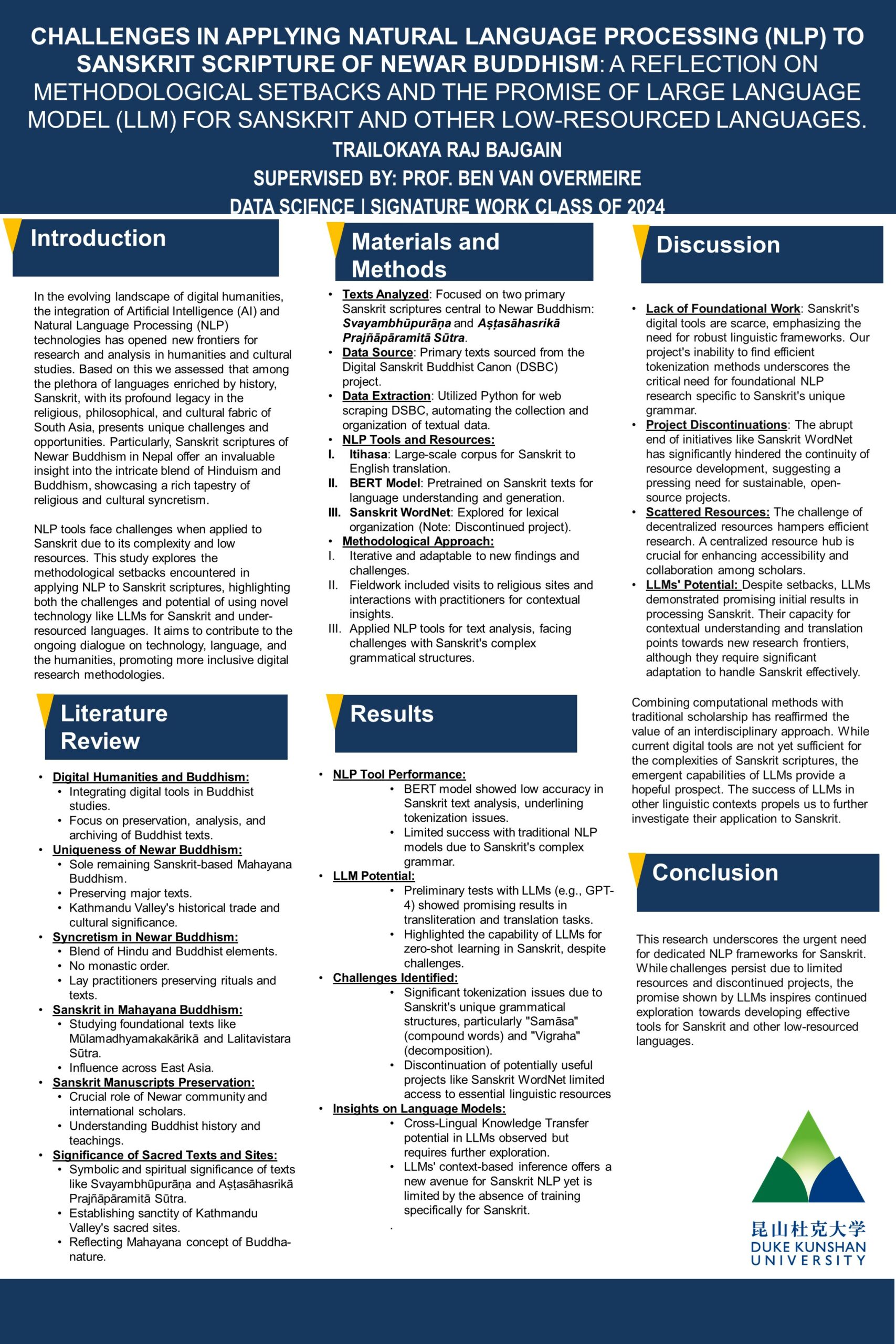 This project, “A Natural Language Processing Study of Sanskrit Scriptures in Newar Buddhism,” focuses on analyzing the Svayambhūpurāṇa and Prajñāpāramitā Sūtra using NLP tools. It addresses the challenge of limited NLP frameworks available for Sanskrit, noting the discontinuation of crucial foundational work. Highlighting the complexity of Sanskrit’s compound and decomposition processes, the project underscores the need for dedicated NLP research in Sanskrit and Buddhist studies. It points towards the potential of Large Language Models to support under-resourced languages like Sanskrit, advocating for the development of foundational NLP tools to advance digital humanities research in this area.