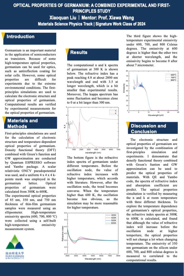 My project is experimental and computational study of optical properties of germanium. Germanium is an important material in the application of semiconductor and optical devices with some high-temperature optical properties. However, some optical properties are difficult for experiments due to the extreme environmental conditions. The first-principles simulations are used to calculate the electronic structure and optical properties of germanium. Room temperature simulations of refractive index and absorption coefficient can correlated to experimental results. Thus, high-temperature n and kappa spectra are calculated subsequently. Since the measured samples are in different thicknesses, the influence of thickness is also explored by the reflectance spectrum. Additionally, high-temperature emissivity spectra of silicon and germanium are measured to add to the optical properties study.