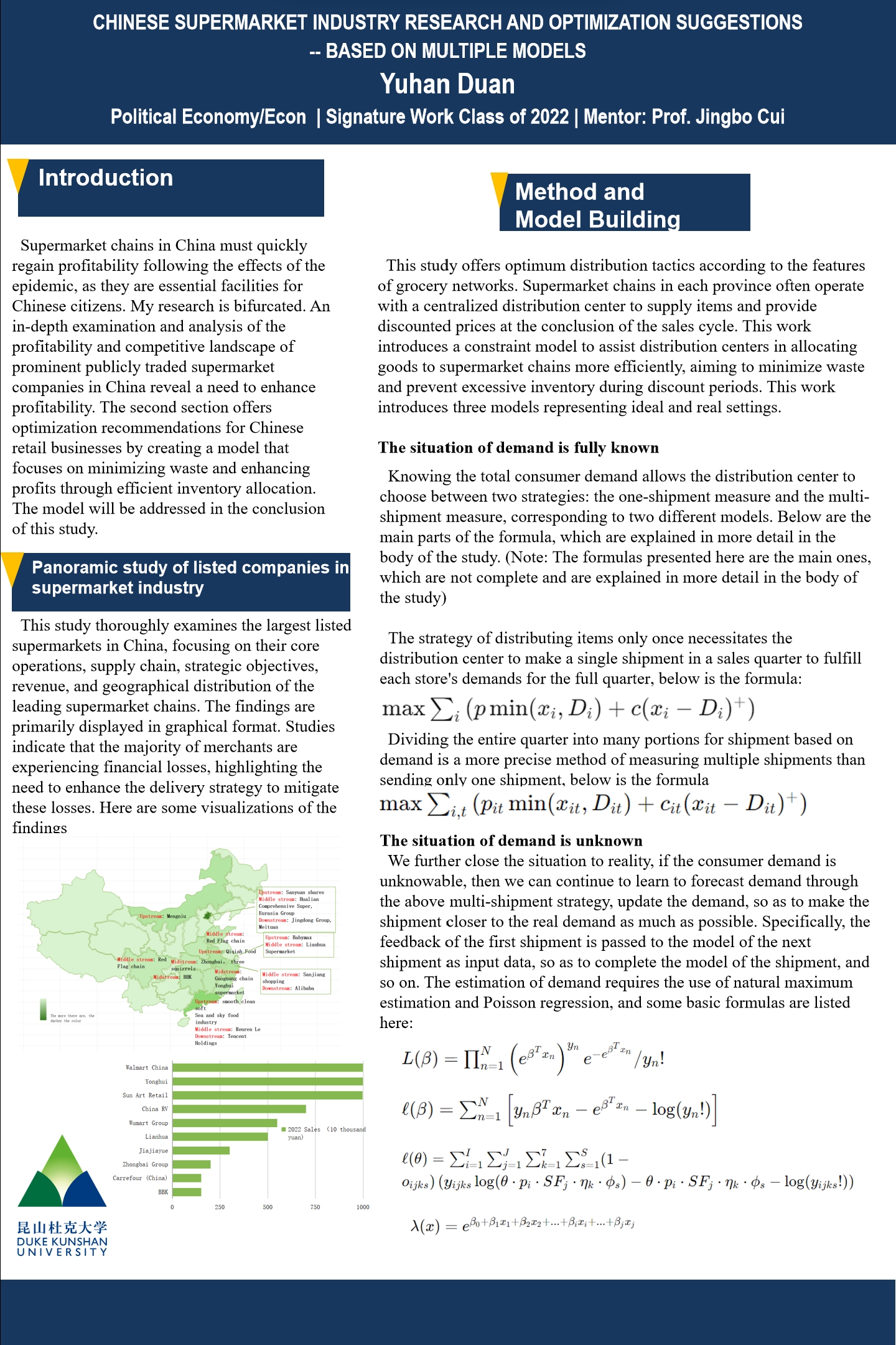 The recent coronavirus outbreak has significantly impacted China’s grocery industry, leading to substantial financial losses for many major supermarket companies. Given this challenge, it is crucial to optimize the warehouse distribution technique. This paper provides a comprehensive analysis of China’s supermarket industry, with a specific focus on the listed firms. It examines the primary business distribution, competitiveness, and operating performance of each listed company. The majority of grocery companies listed are experiencing losses or declining profits. This article offers recommendations for the warehouse center distribution strategy of Chinese grocery enterprises listed on the stock market through the development of a model. This work develops a multi-constraint model ranging from simple to complicated under the assumption that demand is unpredictable. It explores both single shipment and multiple shipment strategies, using maximum likelihood estimation and standard Poisson regression to predict demand. This paper’s research provides guidance for optimizing the management of listed grocery chains in China.