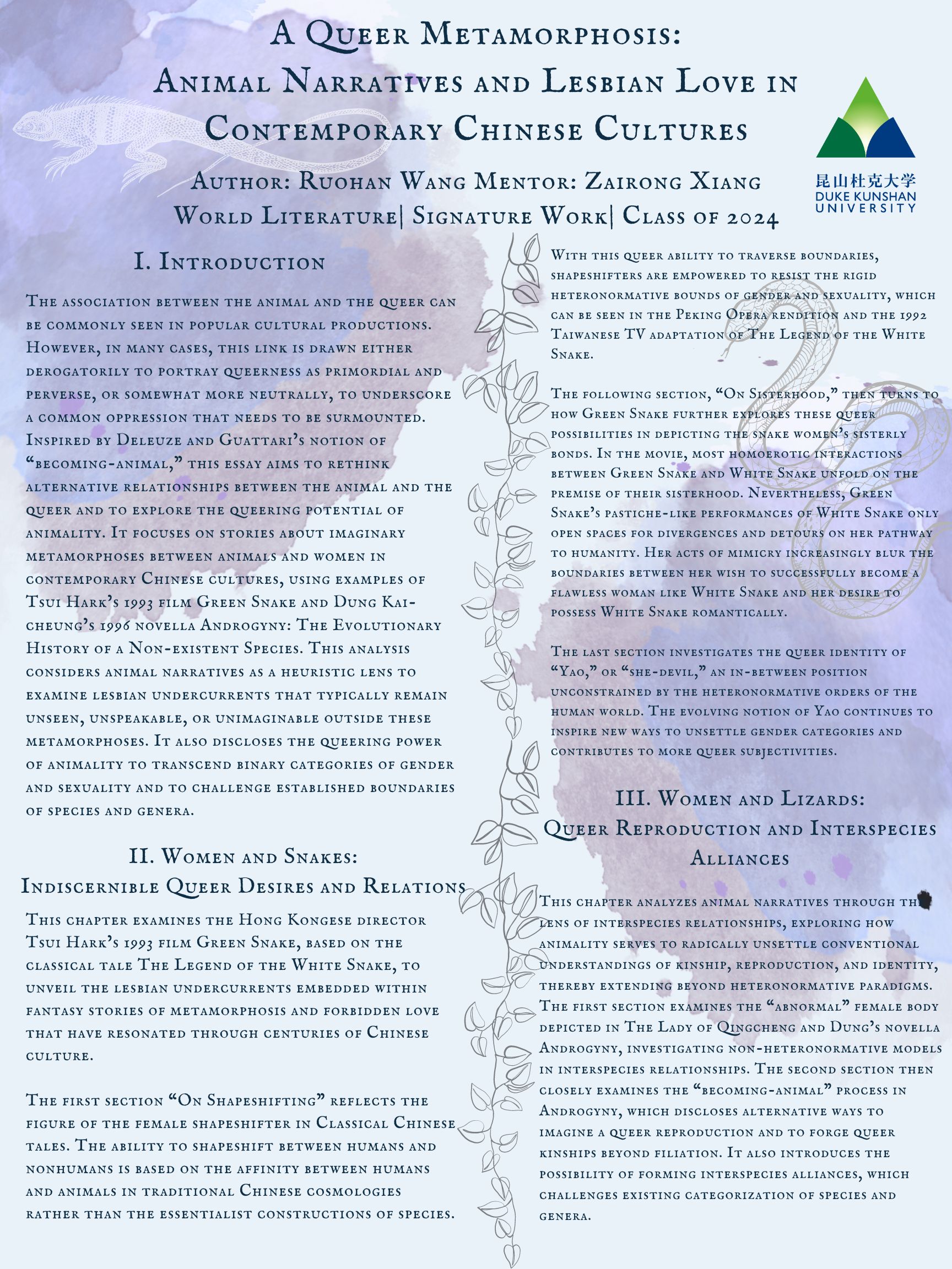 The association between the animal and the queer can be commonly seen in popular cultural productions. However, in many cases, this link is drawn either derogatorily to portray queerness as primordial and perverse, or somewhat more neutrally, to underscore a common oppression that needs to be surmounted. Inspired by Deleuze and Guattari’s notion of “becoming-animal,” this project aims to rethink alternative relationships between the animal and the queer and to explore the queering potential of animality. This essay focuses on stories about imaginary metamorphoses between animals and women in contemporary Chinese cultures, using examples of Tsui Hark’s 1993 film Green Snake and Dung Kai-cheung’s 1996 novella Androgyny: The Evolutionary History of a Non-existent Species. This analysis considers animal narratives as a heuristic lens to examine lesbian undercurrents that typically remain unseen, unspeakable, or unimaginable outside these metamorphoses. It also discloses the queering power of animality to transcend binary categories of gender and sexuality and to challenge established boundaries of species and genera. In this way, this essay offers a new perspective to analyze contemporary queer Chinese cultures, one that invites people to rethink boundaries, communities, and identities beyond anthropocentrism and heteronormativity.