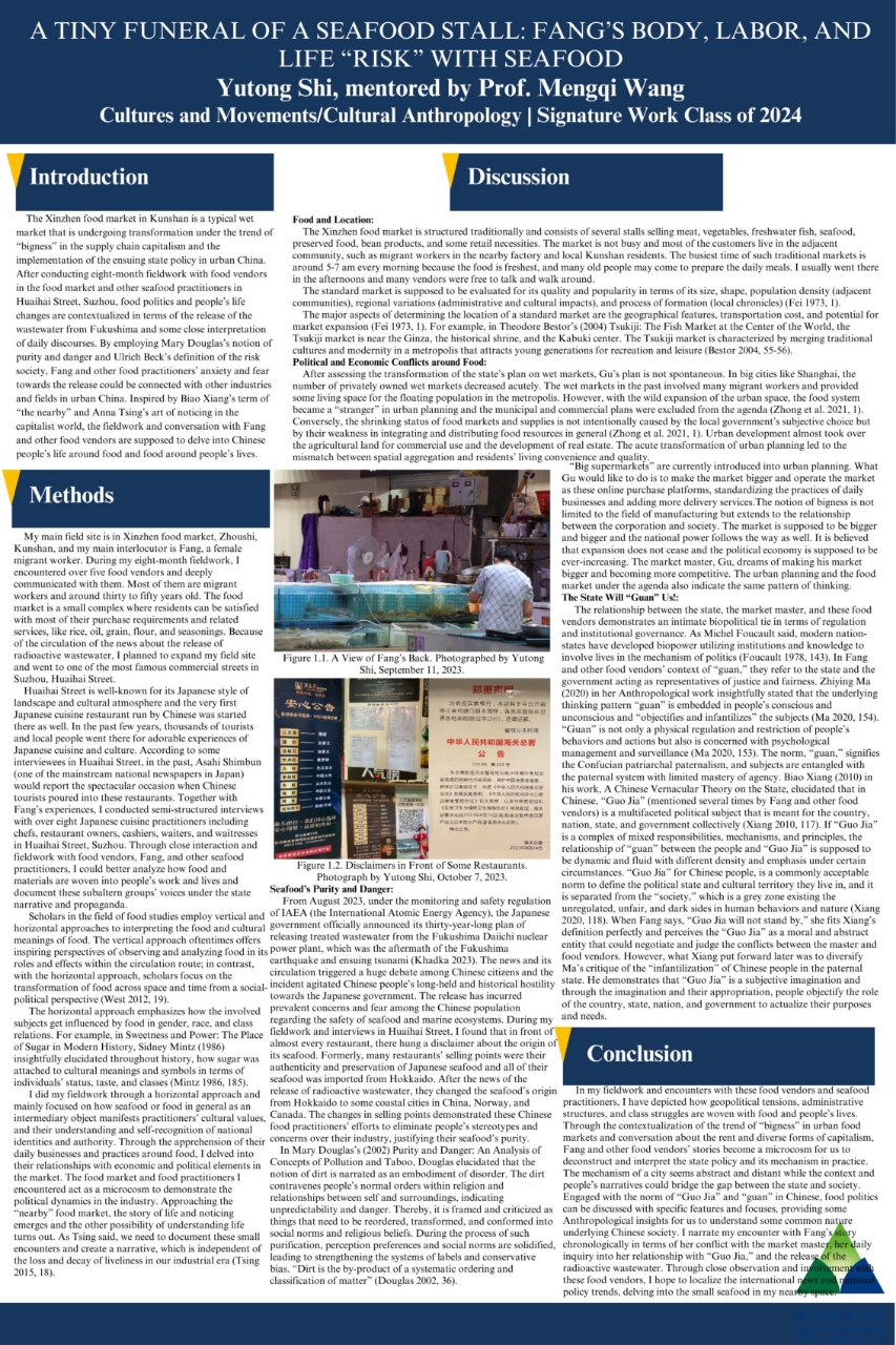 In the paper, my close engagement with ethnographic observation and policy analyses delves into the field of purity and danger, risk society, and individuals’ understandings of the state. I have two field sites and I record how food vendors and practitioners react to the conflicts between the market master, the state, and themselves. They maneuver in between the status as migrant workers and citizens in the city to actualize their needs, appropriating their understanding of the state and the government. During the process, food vendors and seafood practitioners dynamically engage with the big state, interpretation of the state policy, and news circulation, carving their personal narratives. The food story happens in the nearby and the art of noticing the nearby emerges in my fieldwork and ethnographic work. |