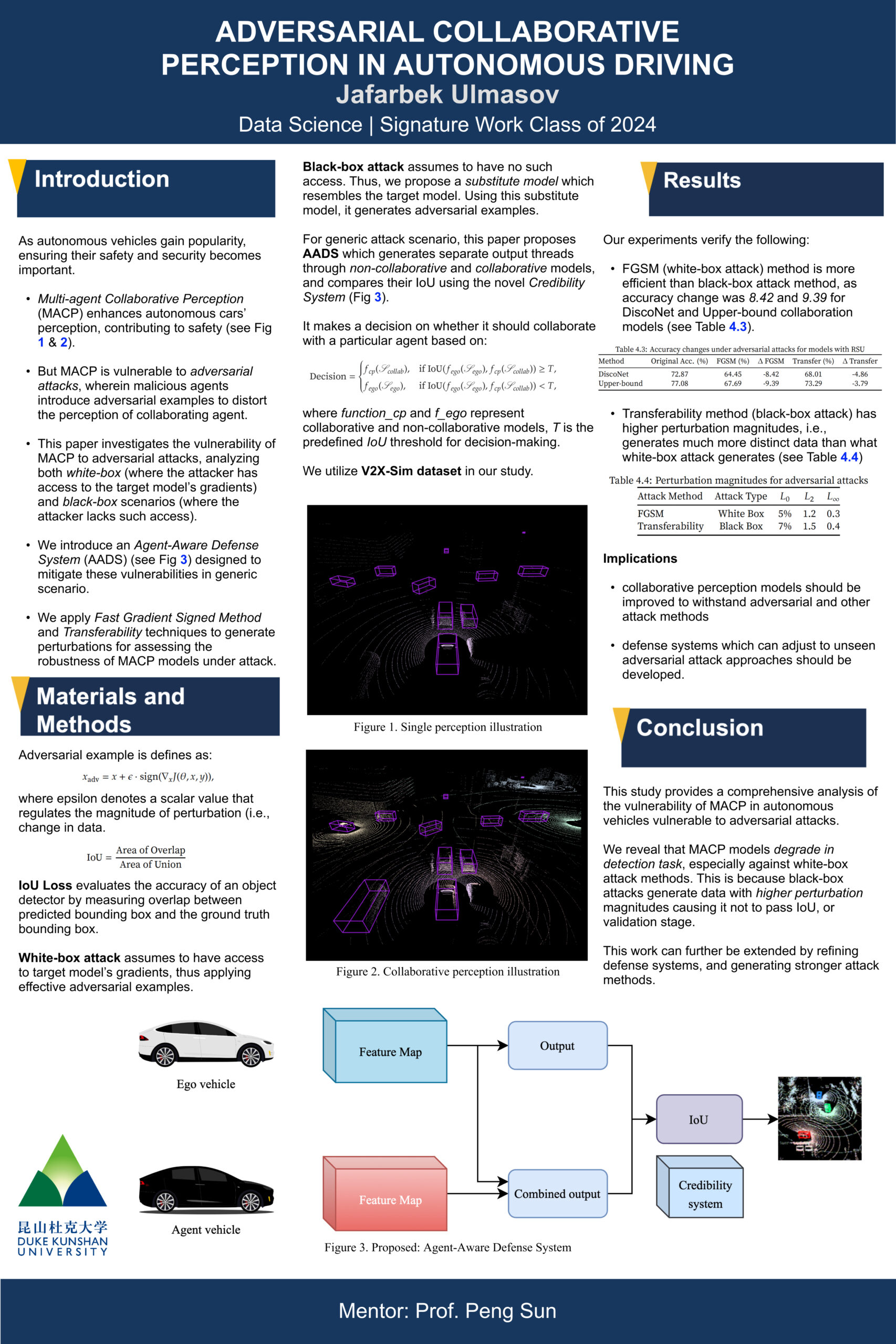 As autonomous vehicles gain popularity, ensuring their safety and security becomes important. Multi-agent Collaborative Perception (MACP) enhances autonomous cars’ perception capabilities, contributing to their safety. Despite its benefits, MACP is vulnerable to adversarial attacks, wherein malicious agents introduce adversarial examples to compromise the perception of recipient vehicles. This paper investigates the vulnerability of MACP to adversarial attacks, analyzing both white-box (where the attacker has access to the target model’s gradients) and black-box scenarios (where the attacker lacks such access). We introduce an Agent-Aware Defense System designed to mitigate these vulnerabilities in generic scenario. Through the application of the Fast Gradient Signed Method and Transferability techniques, we generate perturbations to assess the robustness of MACP models under attack. Our results indicate that white-box attacks are more effective than black-box attacks and that early-stage collaborative methods are particularly susceptible to adversarial manipulation. This study shows the necessity of integrating robust defense mechanisms in the development of collaborative perception frameworks for autonomous vehicles.