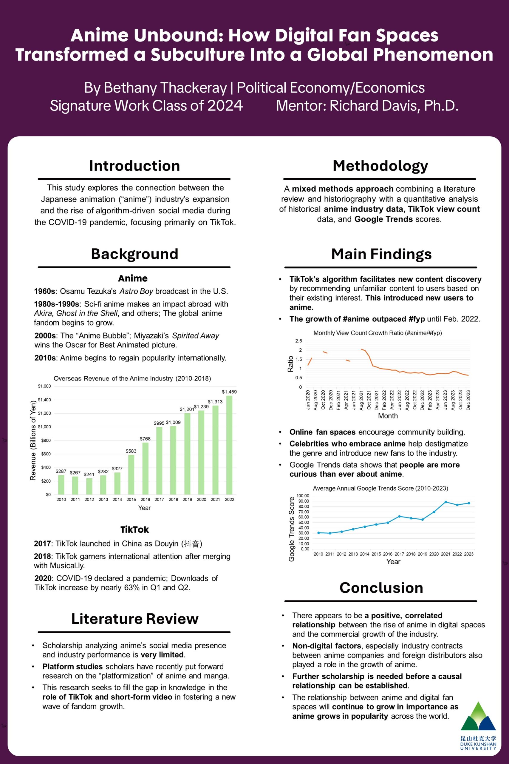 This study investigates the connection between the Japanese animation (“anime”) industry’s expansion and the rise of algorithm-driven social media, specifically focusing on TikTok, during the COVID-19 pandemic. Utilizing a mixed-methods approach combining literature review and historiography with descriptive statistical analysis, the investigation examines how TikTok’s content recommendation algorithm and user-generated content have influenced anime’s visibility and global trajectory. Non-TikTok sources of growth, including the development of digital fandom spaces and indirect destigmatization of anime by celebrities, are also discussed.