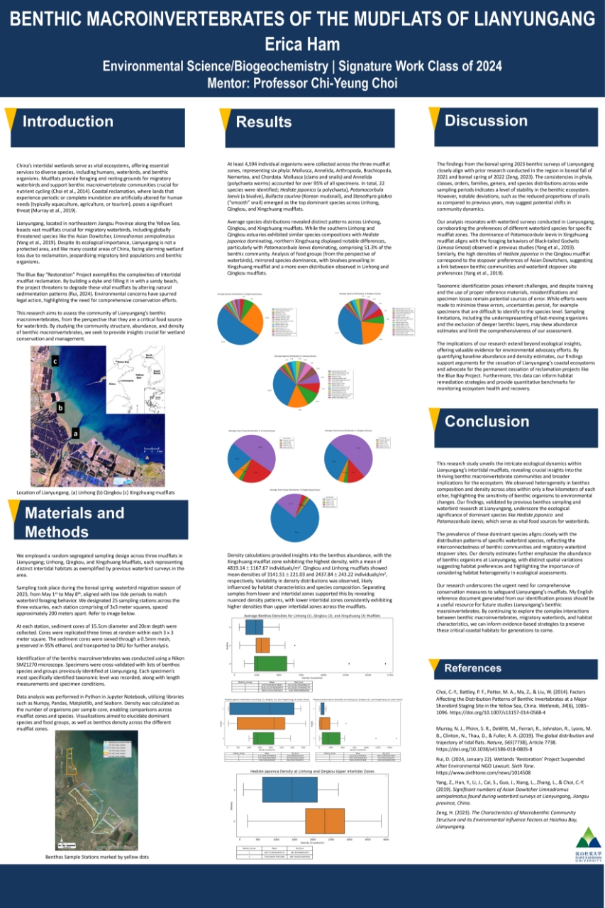 In the world of conservation, Jiangsu Province is famous for its intertidal mudflats on the coast of the Yellow sea, which serve as critical stopover sites for migratory birds of the East-Asian Australasian Flyway. Due to their flat, wide, nature, mudflats provide unique foraging and resting grounds for migratory waterbirds. You may think, what are they eating, the mudflat looks pretty barren! But in reality, there is a world of benthic macroinvertebrates that live right under the surface, from crabs to worms to snails to clams. Not only do these macroinvertebrates provide food for waterbirds, fish, and even humans, they help shape their surroundings by assisting with nutrient and sediment cycling. This research quantifies the benthic community of Lianyungang. |