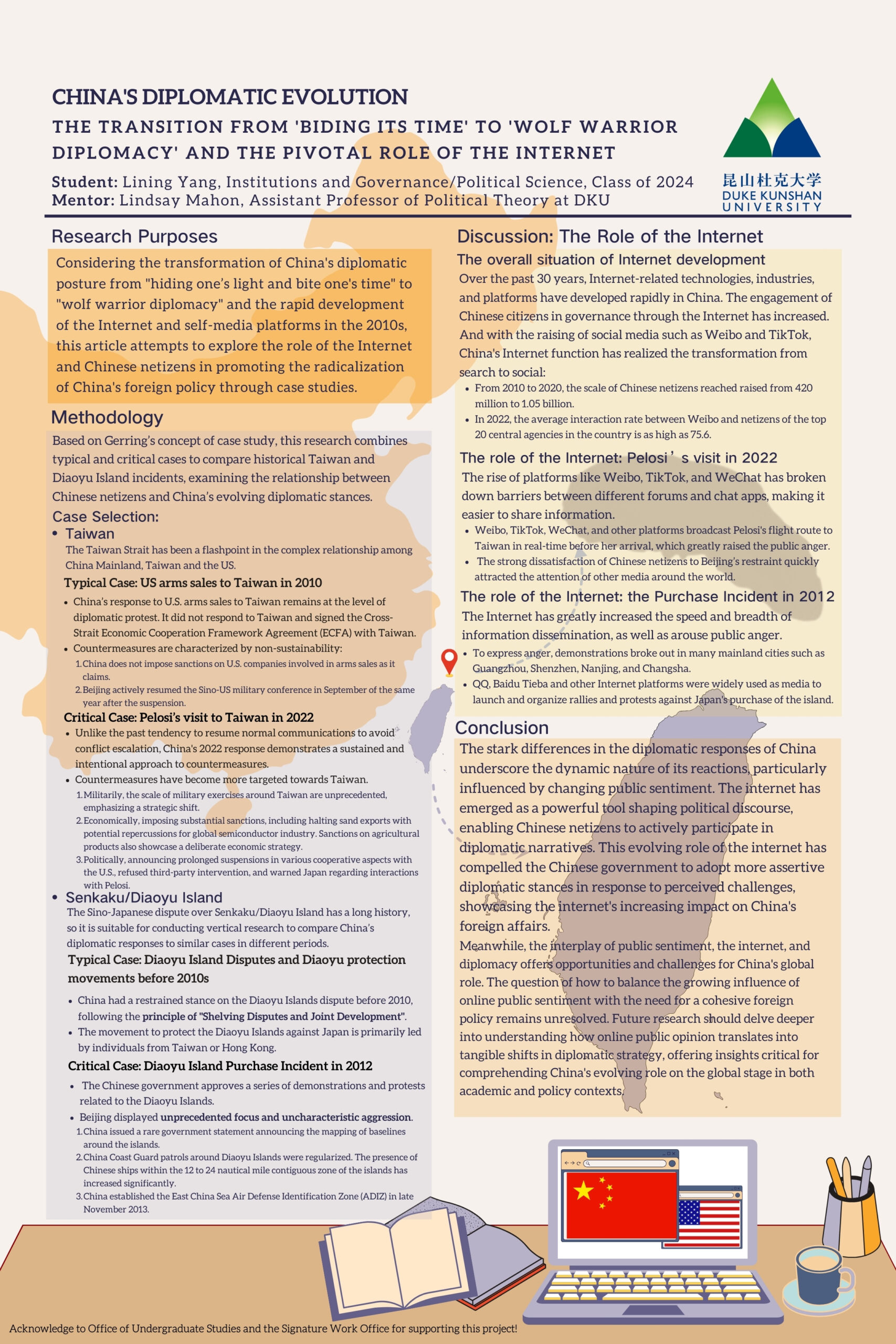 I wrote an essay to explores the transformative impact of the internet on China’s diplomatic posture, tracing the shift from the strategy of “”hide one’s ability to pretend to be weak”” to the assertive “”wolf warrior diplomacy.”” Examining responses to key events, such as U.S. arms sales to Taiwan and Pelosi’s visit to Taiwan, and the Diaoyu Islands dispute, the study reveals a nuanced evolution in China’s international approach. The 2010- 2022 period witnessed increased user engagement and online expression avenues, empowering Chinese citizens in national governance. The internet’s role has evolved from a platform for information dissemination to a catalyst for citizen-government interaction, enabling active participation in shaping diplomatic narratives. The study calls for deeper research into how online public opinion translates into tangible diplomatic strategy shifts, emphasizing the critical importance of understanding this interplay for comprehending China’s evolving global role. As the essay concludes, unraveling the complexities of the internet’s influence on diplomatic dynamics is essential for both academic and policy realms, providing insights into the intricate interplay shaping China’s position on the international stage.