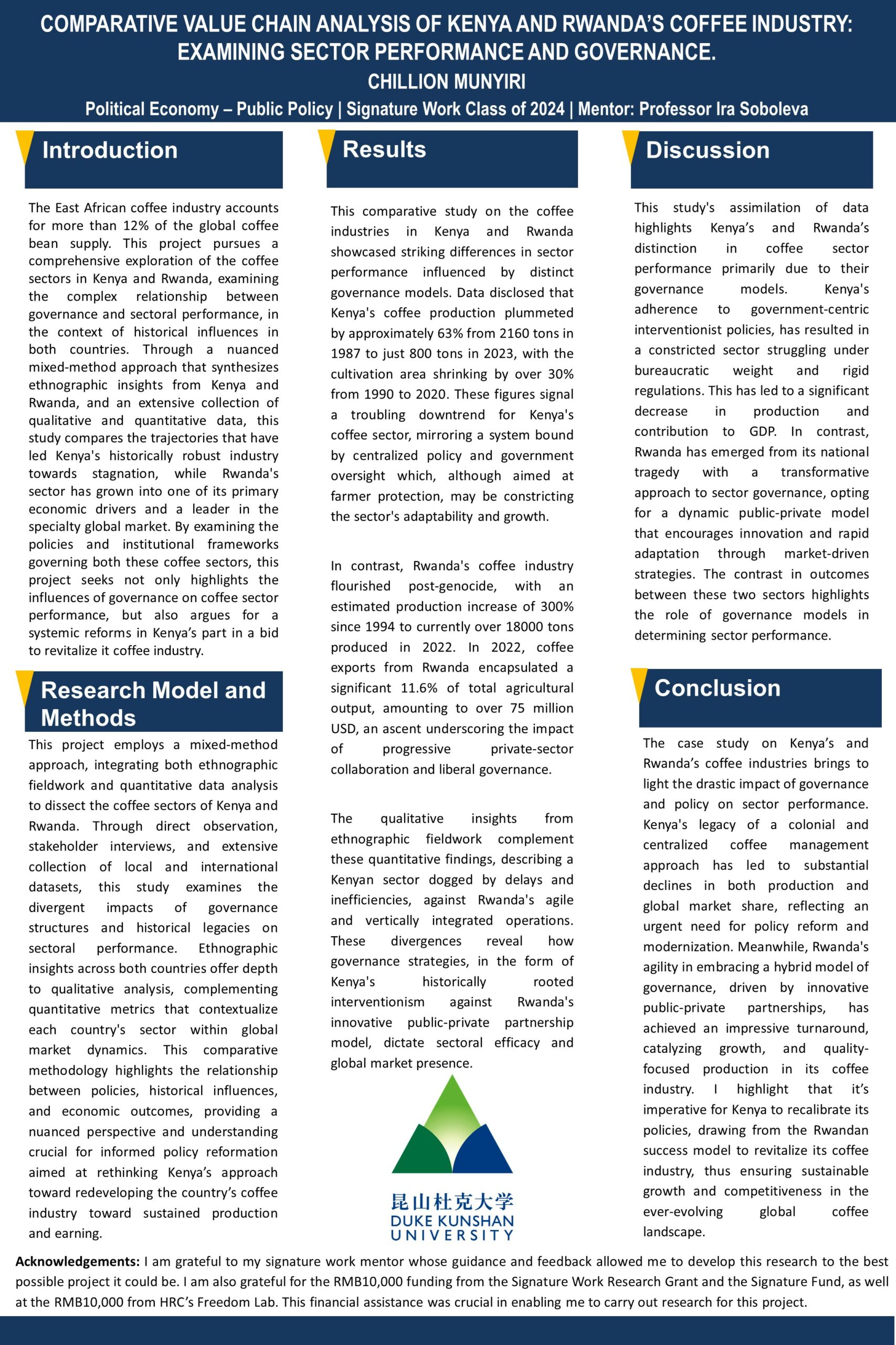 “This research is a comparative analysis of the coffee sector governance in Kenya and Rwanda, shedding light on their historical legacies, contemporary models, and resulting performance. Through an exploration of key economic indicators, governance structures, and historical influences, the study reveals significant differences in productivity and profitability between the two countries. The projects value proposition is geared towards influencing a paradigm shift on how policymakers in Kenya approach coffee reforms. The research attempts to draw attention to the need for fundamental systemic reforms in the governance approach instead of incremental and reactive changes that only address superficial issues. Kenya’s governance framework, deeply influenced by colonial legacies, struggles to meet the sector’s modern needs, leading to stagnation and inefficiencies. In contrast, Rwanda has embraced transformative governance reforms post-genocide, fostering innovation, autonomy, and market responsiveness within its coffee industry. The analysis underscores the enduring impact of colonialism on contemporary governance practices and economic outcomes. Ultimately, the research advocates for Kenya to reflect on and redevelop its governance models, drawing inspiration from Rwanda’s success. By adopting innovative, flexible, and market-responsive strategies, Kenya can unlock the potential of its coffee sector, ensuring competitiveness and sustainability in the dynamic global market.” |