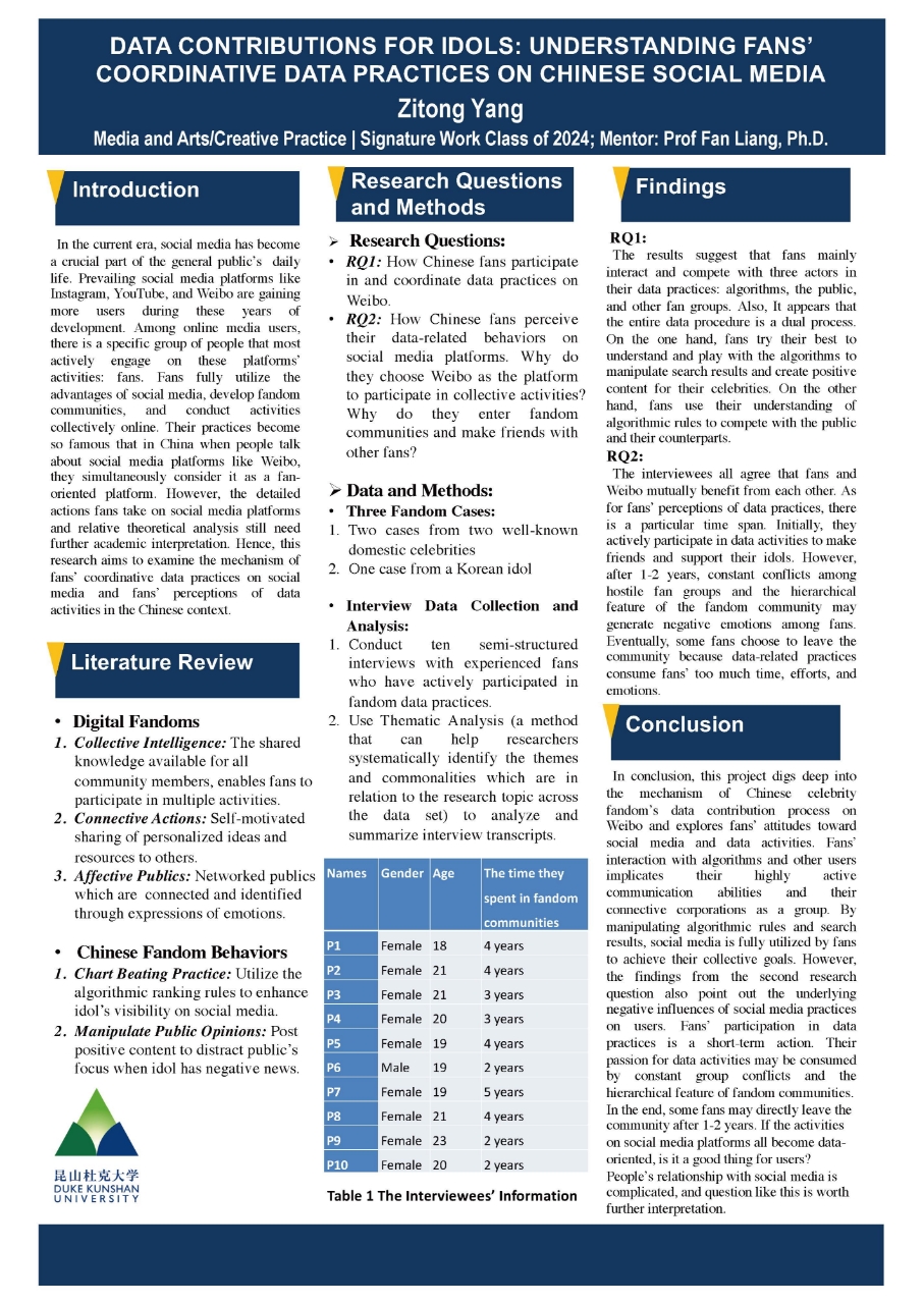 My name is Zitong Yang, major in Media and Arts with the track of Creative Practice. My research interests lies in media and communication studies. This is a paper which incorporates an in-depth discussion about the mechanism of fans' coordinative data practices on Weibo and fans' perceptions.