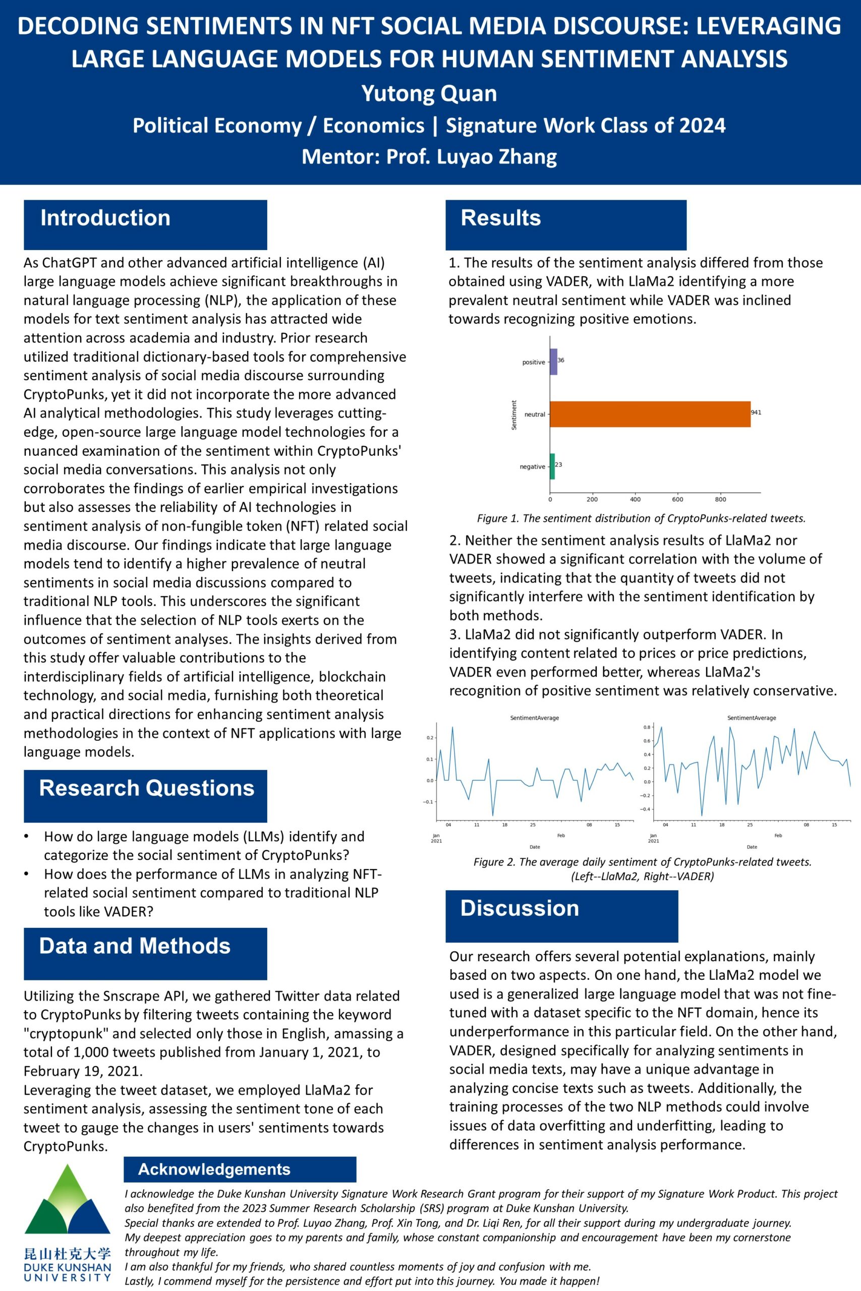 As artificial intelligence (AI) large language models achieve significant breakthroughs in natural language processing (NLP), the application of these models for text sentiment analysis has attracted wide attention across academia and industry. Prior research utilized traditional dictionary-based tools for comprehensive sentiment analysis of social media discourse surrounding CryptoPunks, yet it did not incorporate the more advanced AI analytical methodologies. This study leverages cutting-edge, open-source large language model technologies for a nuanced examination of the sentiment within CryptoPunks’ social media conversations. This analysis not only corroborates the findings of earlier empirical investigations but also assesses the reliability of AI technologies in sentiment analysis of non-fungible token (NFT) related social media discourse. Our findings indicate that large language models tend to identify a higher prevalence of neutral sentiments in social media discussions compared to traditional NLP tools. This underscores the significant influence that the selection of NLP tools exerts on the outcomes of sentiment analyses. The insights derived from this study offer valuable contributions to the interdisciplinary fields of artificial intelligence, blockchain technology, and social media, furnishing both theoretical and practical directions for enhancing sentiment analysis methodologies in the context of NFT applications with large language models.