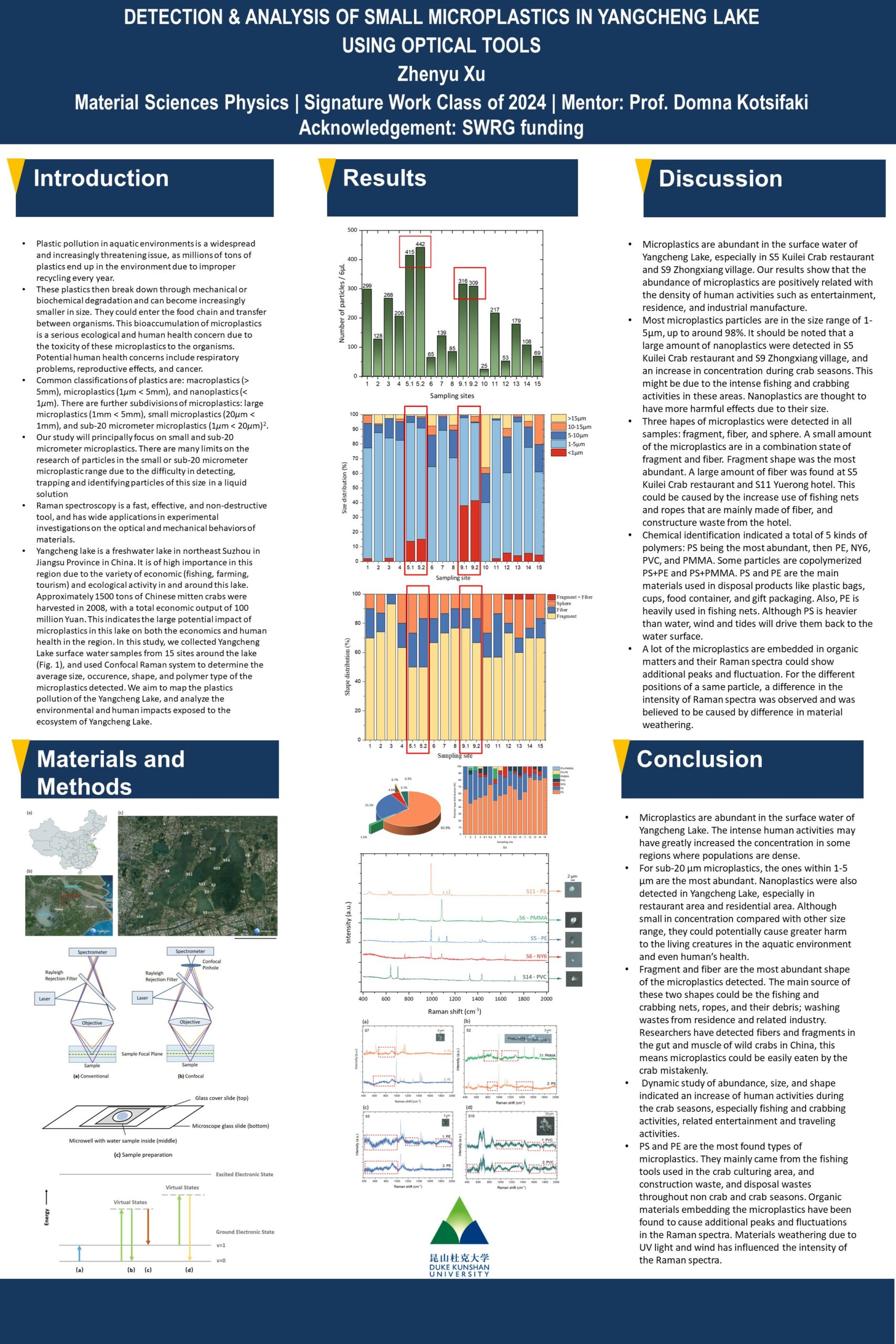 A large amount of plastic waste ends up in aquatic environments. These plastics then break down through mechanical or biochemical degradation and can become increasingly smaller in size. Though these microplastics may not be visible to the naked eye, they are still present and can be more easily ingested by organisms. Moreover, microplastics pose a potential threat to aquatic organisms as well as their transfer through the trophic chain, which has impacts on human health. The main goal of this project is to map the microplastics pollution in Yangcheng lake, which is a famous crab culturing lake in China. Freshwater samples at the surface of the lake were collected and analyzed using Confocal Raman spectroscopy to determine microplastics abundance, size, shape, and chemical composition in the aquatic environment. Especially, the focus of this study was on microplastics in sub 20μm due to the large proportion of microplastics in the water environment in this size range. By understanding the source and fate of the detected microplastics, this study also tried to analyze the environmental and human impacts exposed to the ecosystem of Yangcheng Lake. We hope to raise people’s awareness of microplastics, strengthen the detection and monitoring of microplastics in food and ecological environment. |