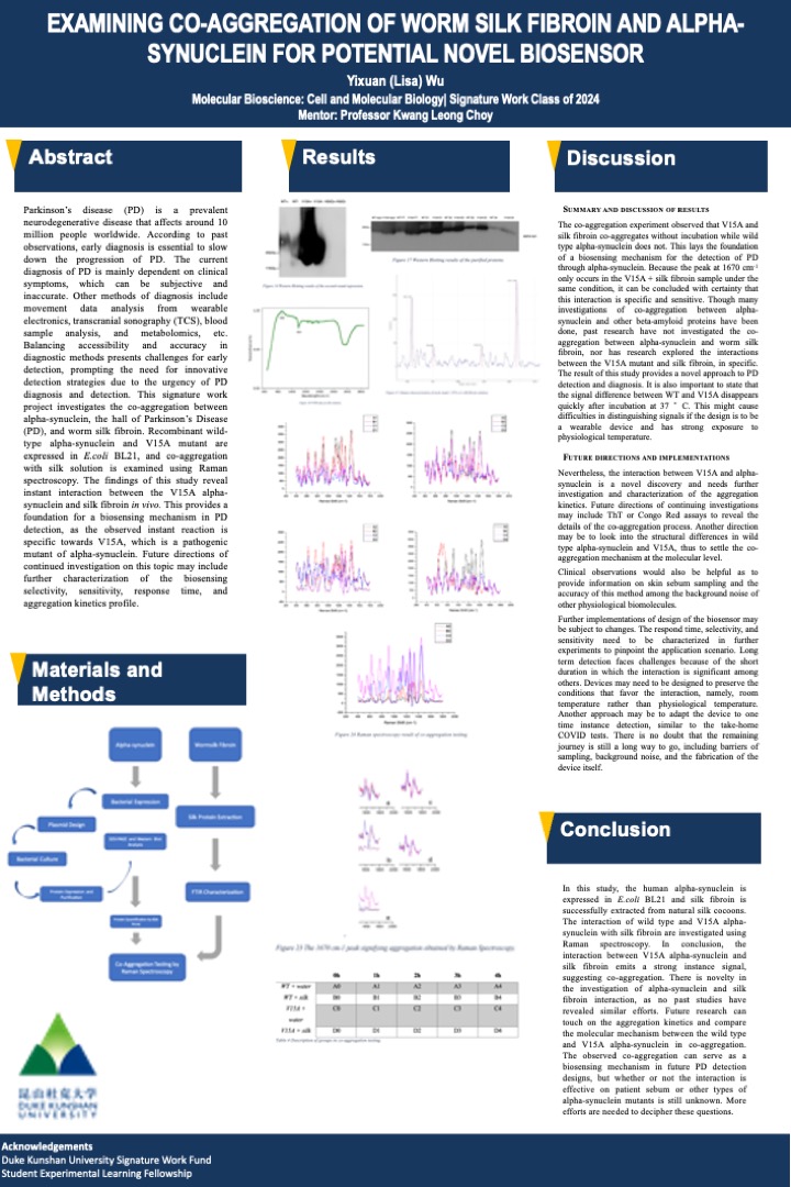 Parkinson’s disease (PD) is a prevalent neurodegenerative disease that affects around 10 million people worldwide. According to past observations, early diagnosis is essential to slow down the progression of PD. The current diagnosis of PD is mainly dependent on clinical symptoms, which can be subjective and inaccurate. Other methods of diagnosis include movement data analysis from wearable electronics, transcranial sonography (TCS), blood sample analysis, and metabolomics, etc. Balancing accessibility and accuracy in diagnostic methods presents challenges for early detection, prompting the need for innovative detection strategies due to the urgency of PD diagnosis and detection. This signature work project investigates the co-aggregation between alpha-synuclein, the hall of Parkinson’s Disease (PD), and worm silk fibroin. Recombinant wild-type alpha-synuclein and V15A mutant are expressed in E.coli BL21, and co-aggregation with silk solution is examined using Raman spectroscopy. The findings of this study reveal instant interaction between the V15A alpha-synuclein and silk fibroin in vivo. This provides a foundation for a biosensing mechanism in PD detection, as the observed instant reaction is specific towards V15A, which is a pathogenic mutant of alpha-synuclein. Future directions of continued investigation on this topic may include further characterization of the biosensing selectivity, sensitivity, response time, and aggregation kinetics profile. |