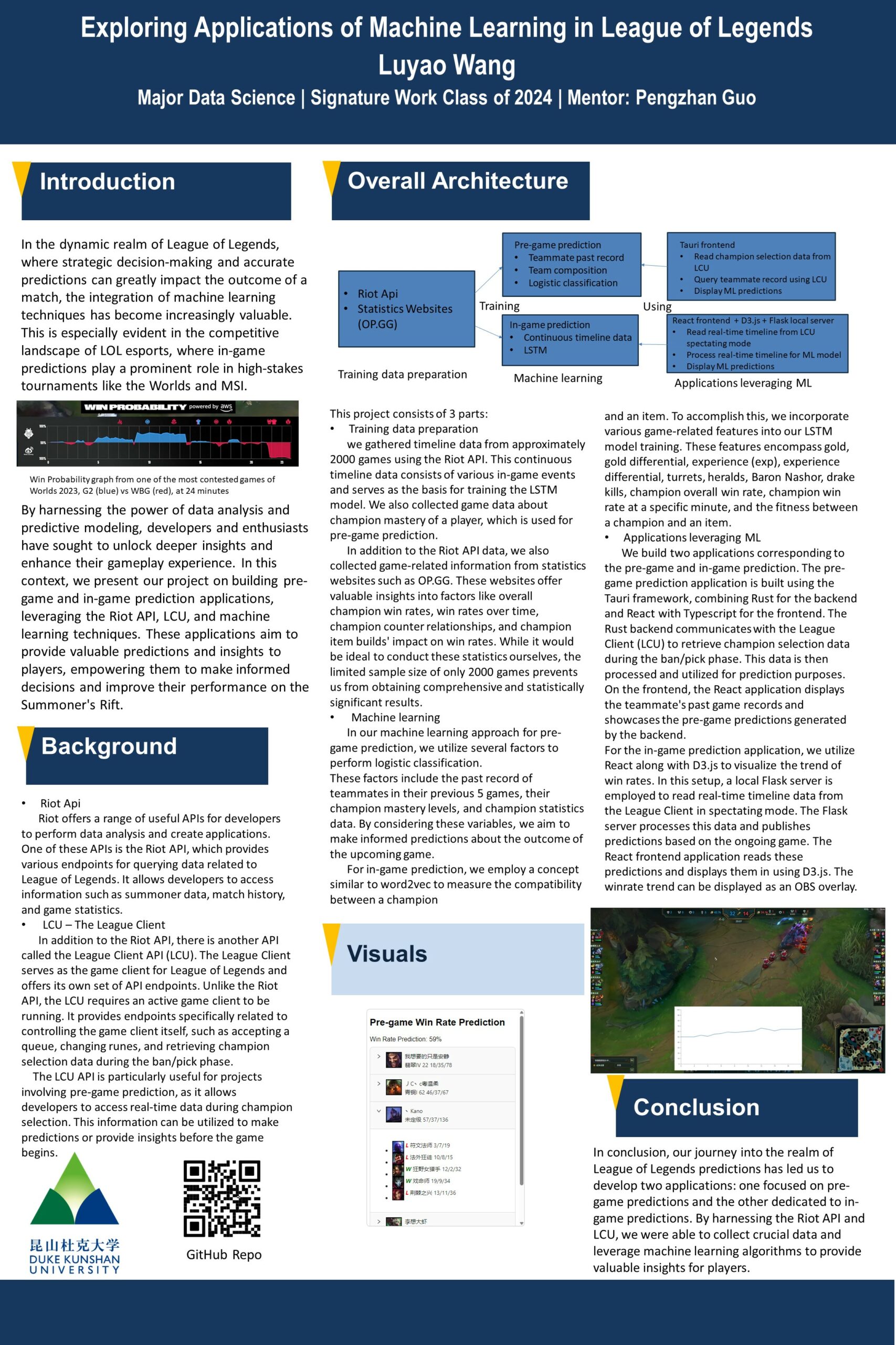 This project demonstrates the value of integrating machine learning techniques in League of Legends for strategic decision-making and accurate predictions. By utilizing the Riot API, LCU, and machine learning algorithms, pre-game and in-game prediction applications were developed. Data from the Riot API and statistics websites were gathered, and word embedding techniques were applied to provide insights on champion and item compatibility. LSTM models were used for real-time in-game win rate prediction, particularly important in high-stakes tournaments. The project includes a Tauri application for pre-game prediction, empowering players to make informed decisions and enhance their performance. Additionally, a frontend overlay for in-game prediction adds value to the viewing experience of LoL matches in spectating mode. It showcases the growing significance of machine learning in League of Legends and highlights the potential for further development using Riot API, LCU API, and machine learning algorithms.