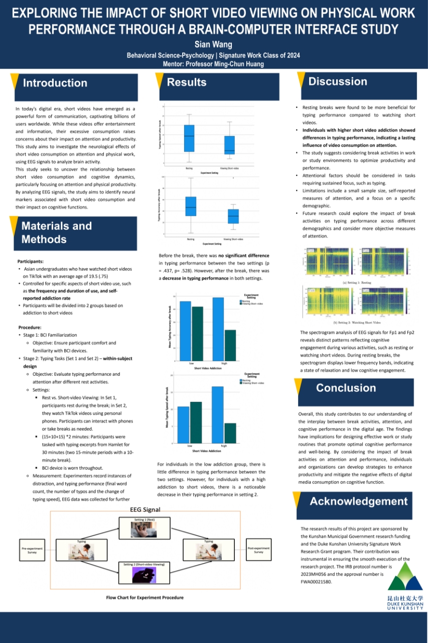 Sian’s Signature Work project explores the impact of short video consumption on attention and physical work. Using non-invasive Brain-Computer Interface (BCI) technology, specifically the openBCI device, Sian monitored participants’ brain activity while they engaged in short video consumption. The study aims to uncover insights into how short video consumption affects attention levels and physical work performance, especially typing performance, with potential implications for understanding modern media consumption habits and their impact on cognitive processes and productivity. |