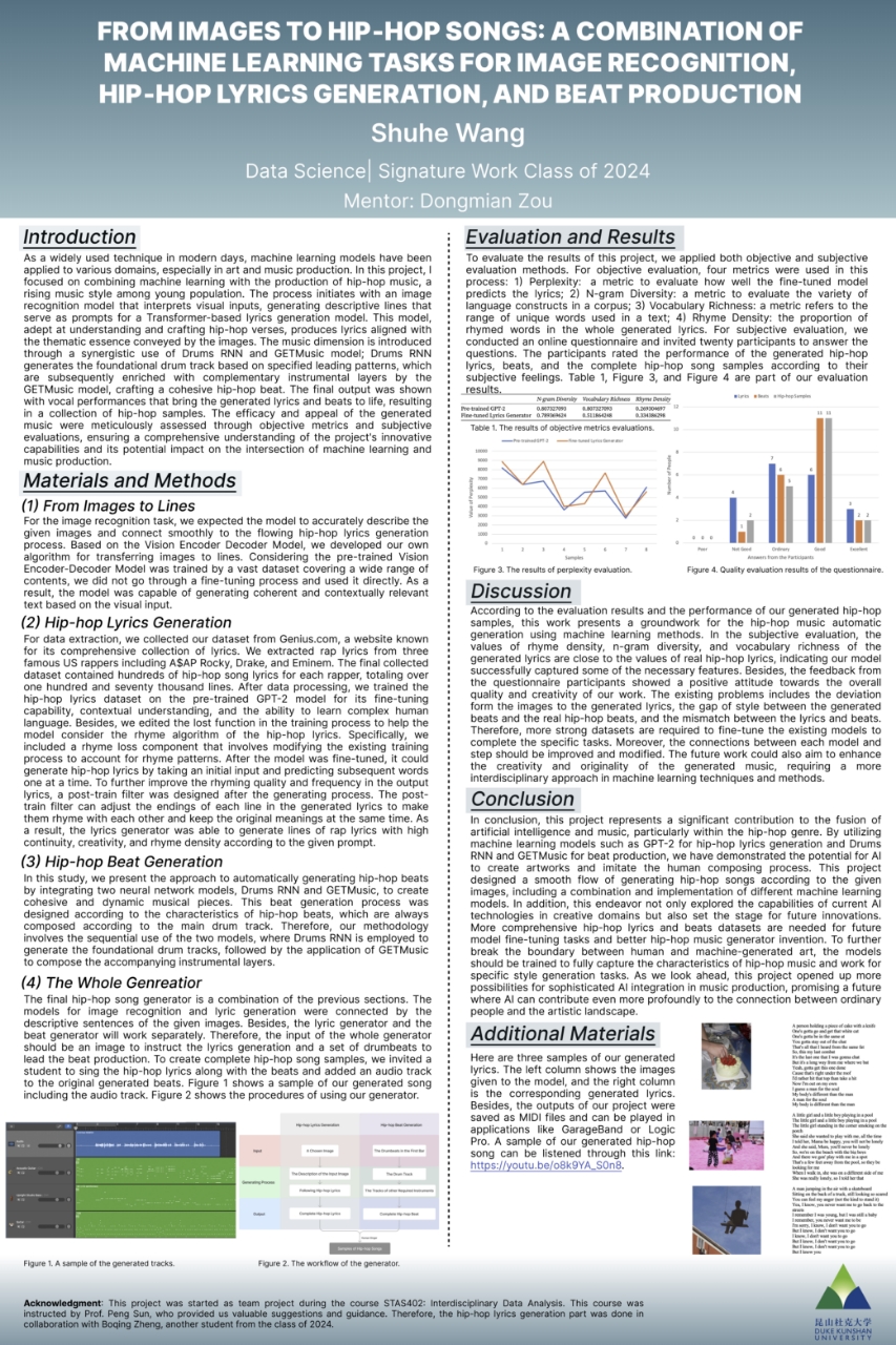 As a widely used technique in modern days, machine learning models have been applied to various domains, especially in art and music production. In this project, I focused on combining machine learning with the production of hip-hop music, a rising music style among young population. The process initiates with an image recognition model that interprets visual inputs, generating descriptive lines that serve as prompts for a Transformer-based lyrics generation model. This model, adept at understanding and crafting hip-hop verses, produces lyrics aligned with the thematic essence conveyed by the images. The music dimension is introduced through a synergistic use of Drums RNN and GETMusic model; Drums RNN generates the foundational drum track based on specified leading patterns, which are subsequently enriched with complementary instrumental layers by the GETMusic model, crafting a cohesive hip-hop beat. The final output was shown with vocal performances that bring the generated lyrics and beats to life, resulting in a collection of hip-hop samples. The efficacy and appeal of the generated music were meticulously assessed through objective metrics and subjective evaluations, ensuring a comprehensive understanding of the project’s innovative capabilities and its potential impact on the intersection of machine learning and music production. |