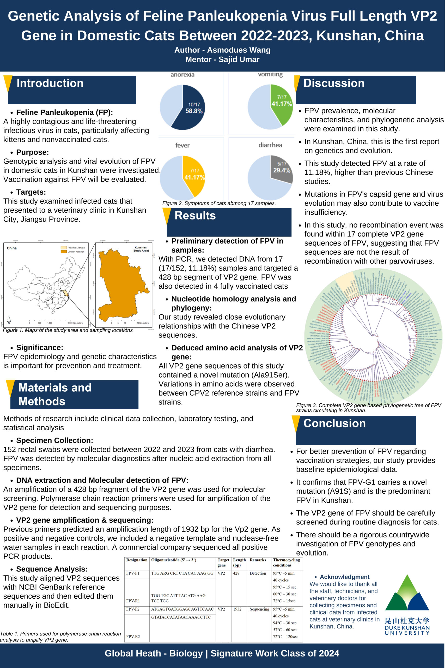 Our study provides baseline epidemiological data for policy makers for a better prevention of FPV regarding to vaccination strategies. This study confirms that FPV-G1 carries a novel mutation (A91S) and is the predominant group of FPV infecting cats in Kunshan. Therefore, we urge careful screening of cats for VP2 gene of FPV during routine diagnosis to determine the genotypes. In addition, a rigorous countrywide investigation of genotypic and evolutionary characteristics of FPV is warranted.