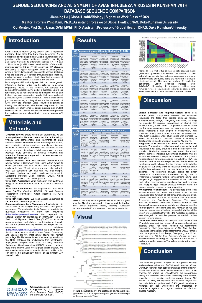 The signature work project titled “Genome Sequencing and Alignment of Avian Influenza Viruses in Kunshan with Database Sequence Comparison” by Jianning He, under the mentorship of Prof. Yiu Wing Kam and Prof. Sajid Umar, aims to investigate the genetic relationships and evolutionary dynamics of Avian Influenza Viruses (AIVs) found in Kunshan, China, in relation to strains documented across different geographical regions in China. This research focuses on the comprehensive analysis of the HA protein genome sequences of AIV strains collected in Kunshan, comparing them with those available in online databases to identify genetic variations and potential new mutants. The study discovered that the HA gene sequences of all five AIV strains from Kunshan precisely matched those recorded in existing online databases, indicating an absence of new mutations within the samples during the study period. This research contributes to the understanding of AIV evolution and highlights the importance of continuous monitoring and genetic analysis to inform public health strategies and vaccine development efforts against AIV strains. |